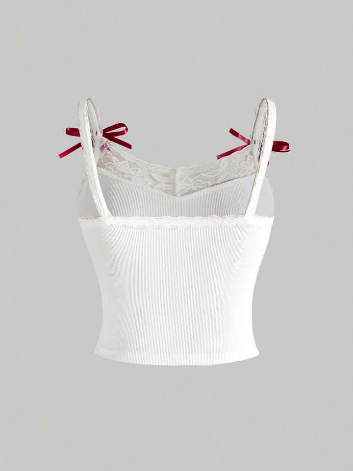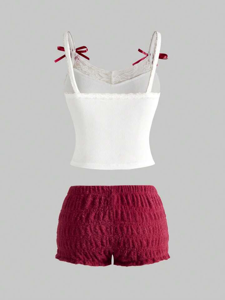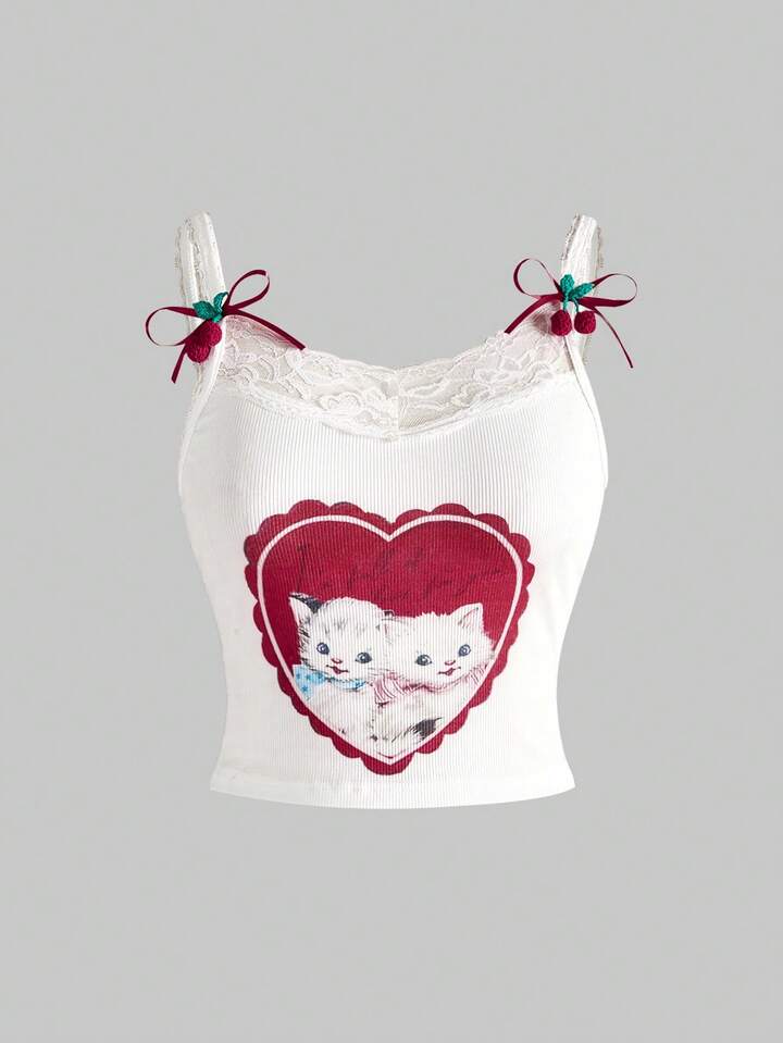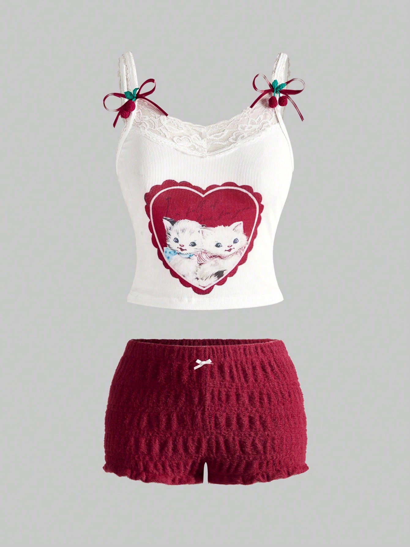 Kawaii Set de 2 piezas con top de tirantes con encaje y estampado de gatitos, y shorts fruncidos de estilo casual para mujer