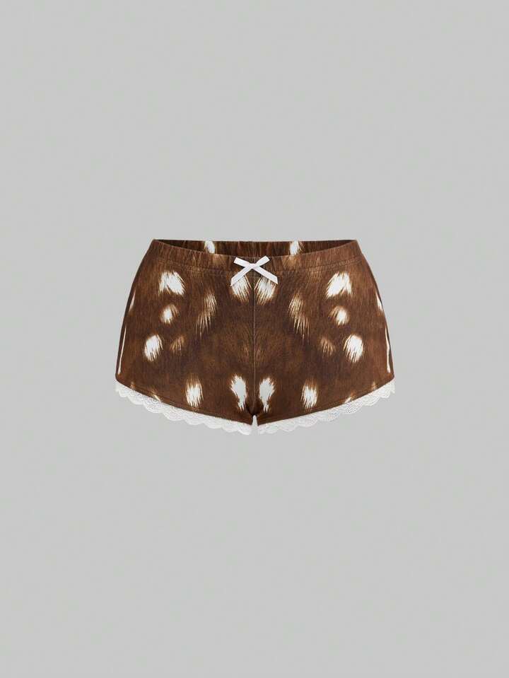 Kawaii Set de 2 piezas con top ajustado con encaje en contraste y estampado de ciervos, y mini shorts de tiro súper bajo