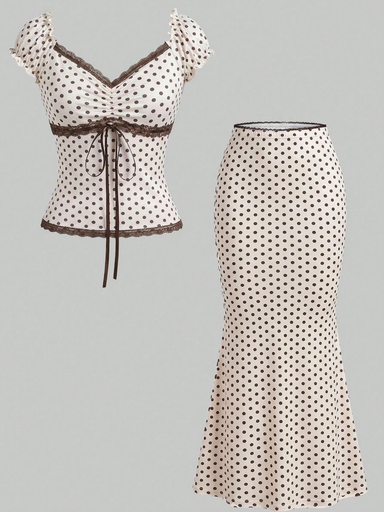 Kawaii Set de 2 piezas de ropa de verano para mujer, blusa ajustada con cuello en V, decoración de moño y contraste de lunares, parche de encaje, y falda