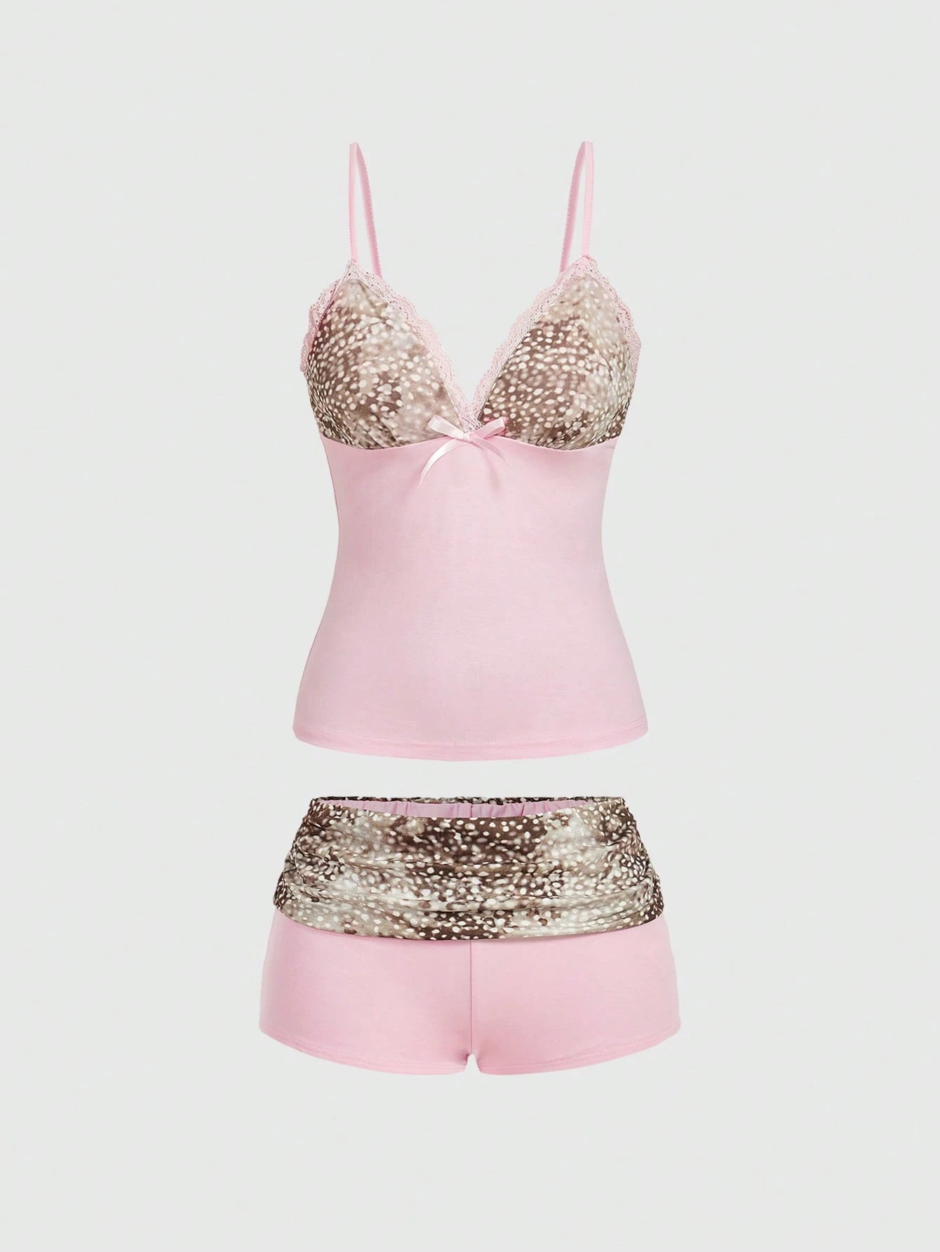 Kawaii Conjunto de 2 piezas de pantalones cortos de tiro bajo con lazo de encaje y estampado de ciervos estilo Y2K para mujeres