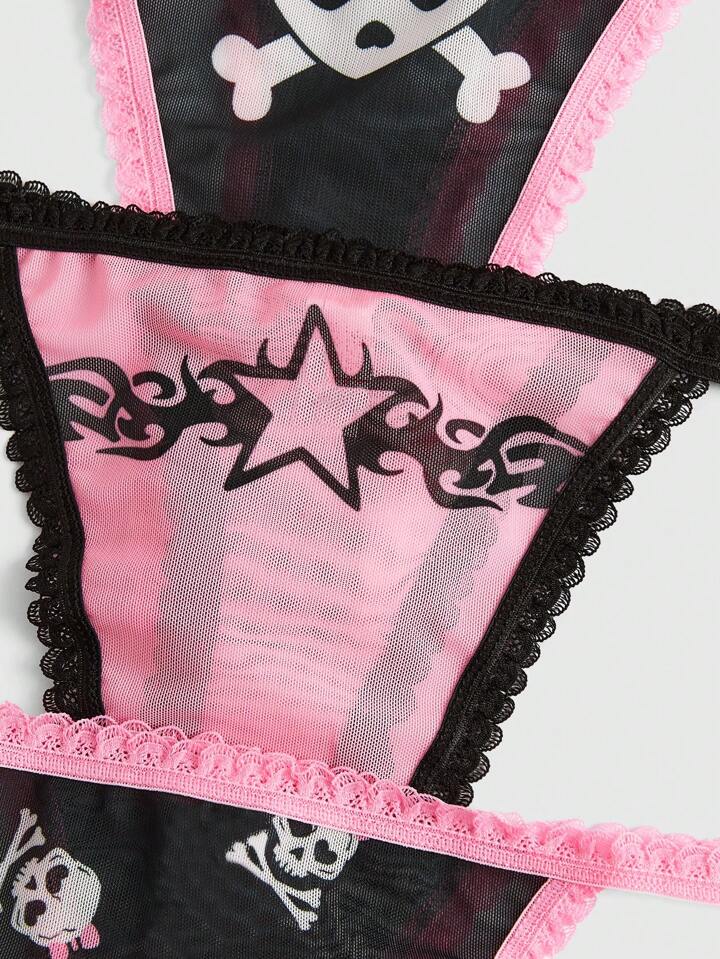 Kawaii 3 piezas Set tanga con estampado de cráneo con encaje en contraste