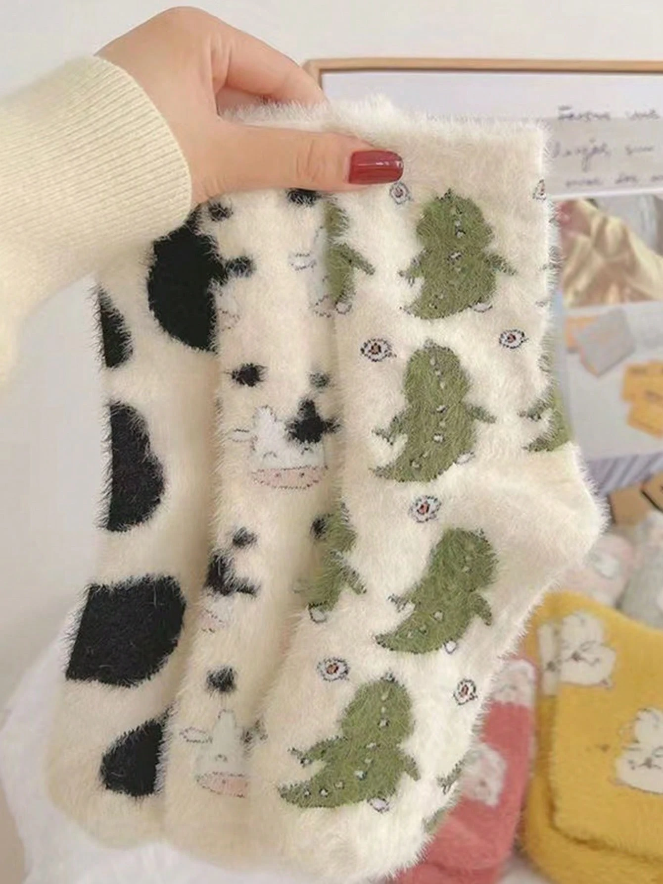 Kawaii 3 Pares Calcetines De Media Pantorrilla De Terciopelo Cálido Para Mujer Con Estampado De Vaca Y Puntos En Invierno