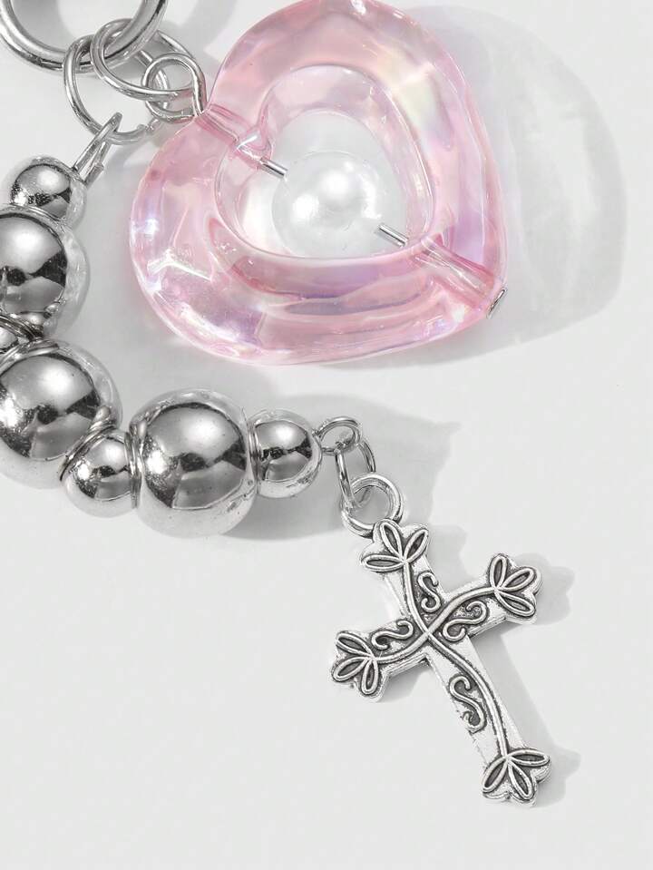 Kawaii Juego de 3 piezas de llavero, pendiente y adorno para auricular con perlas falsas, diseños de corazón, estrella y cruz en acabado plateado minimalista y elegante, apto para mujer, uso diario o regalo