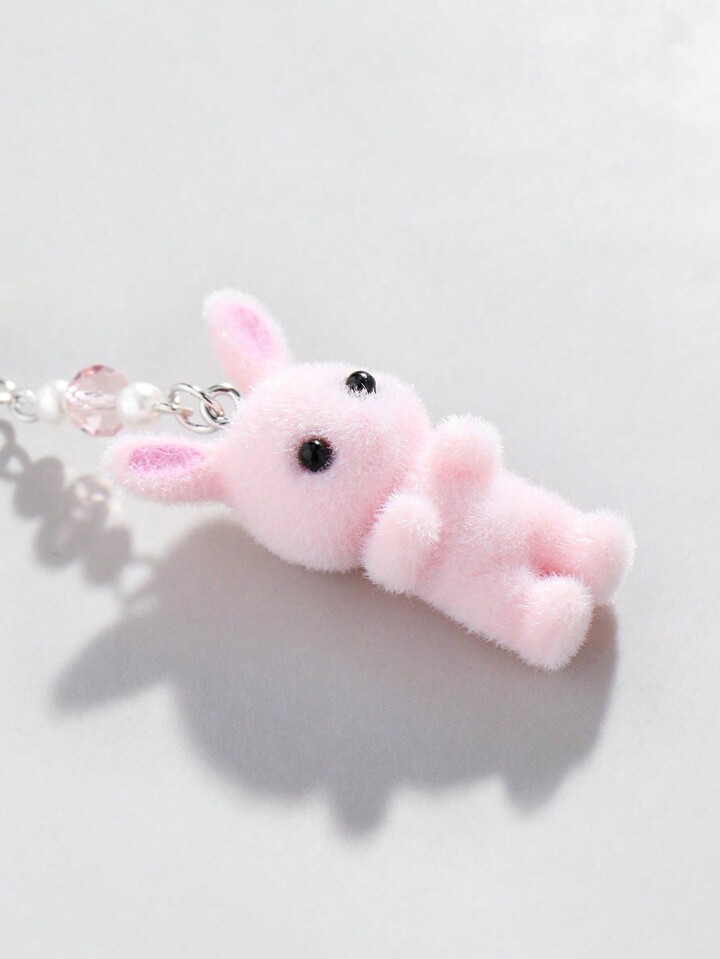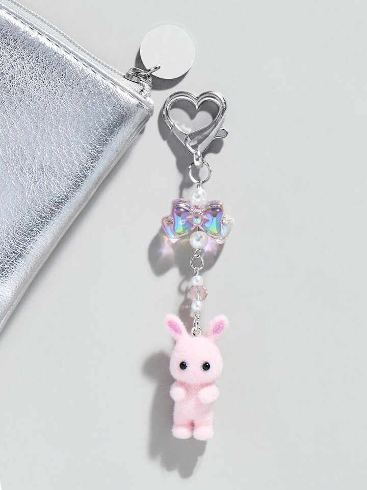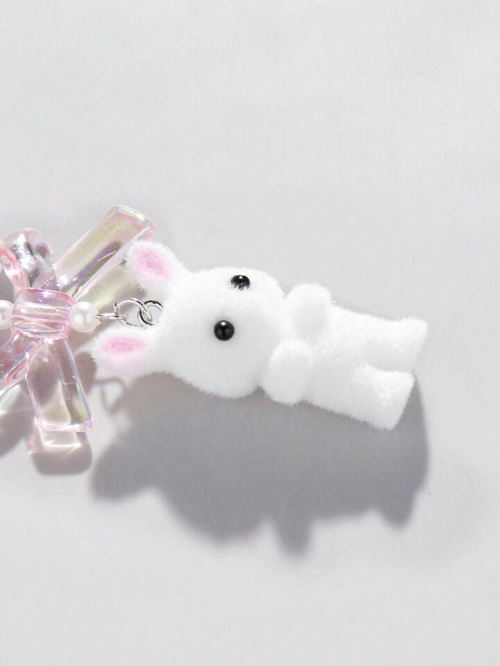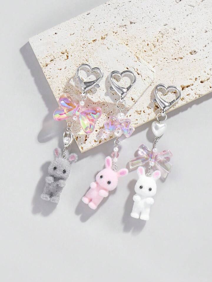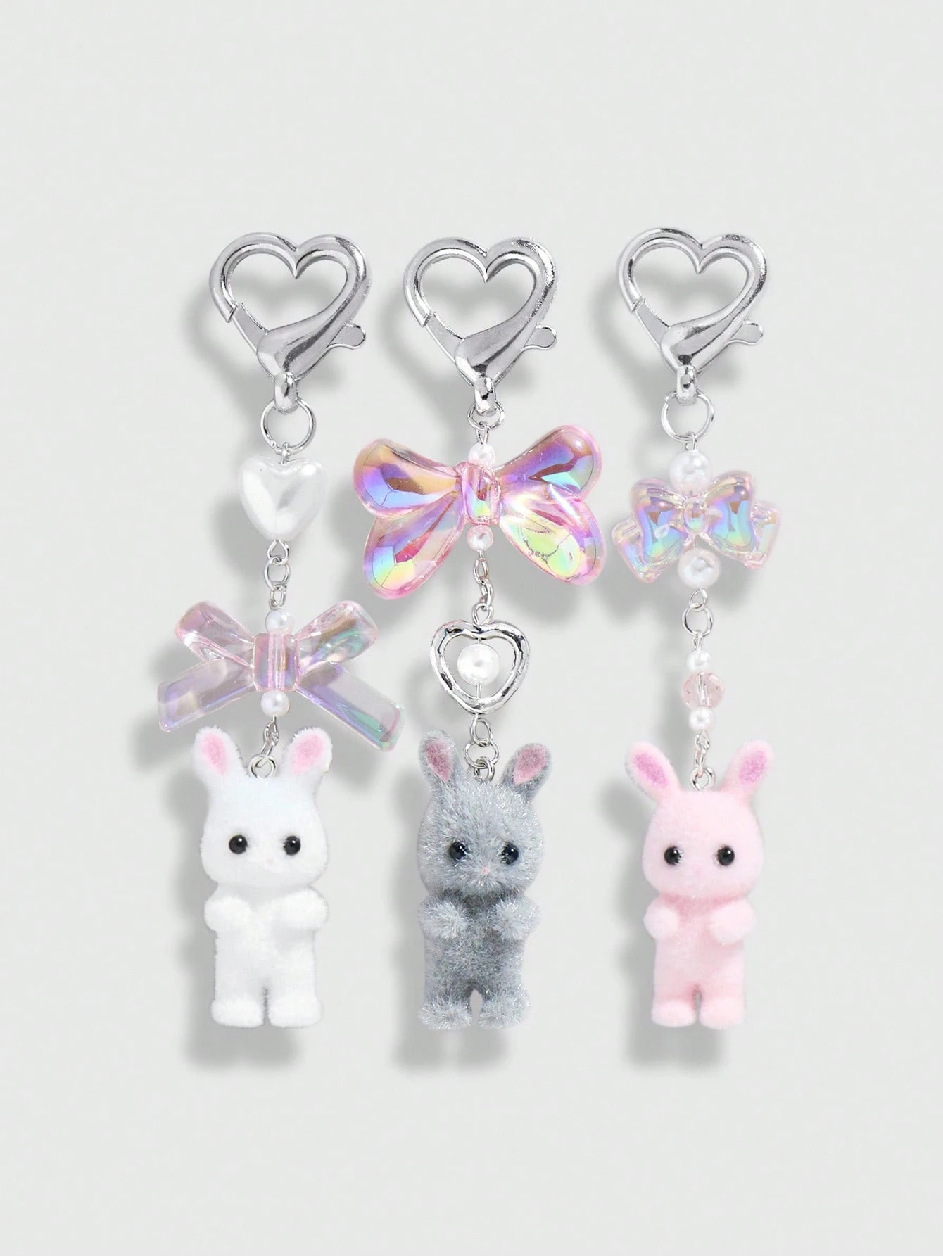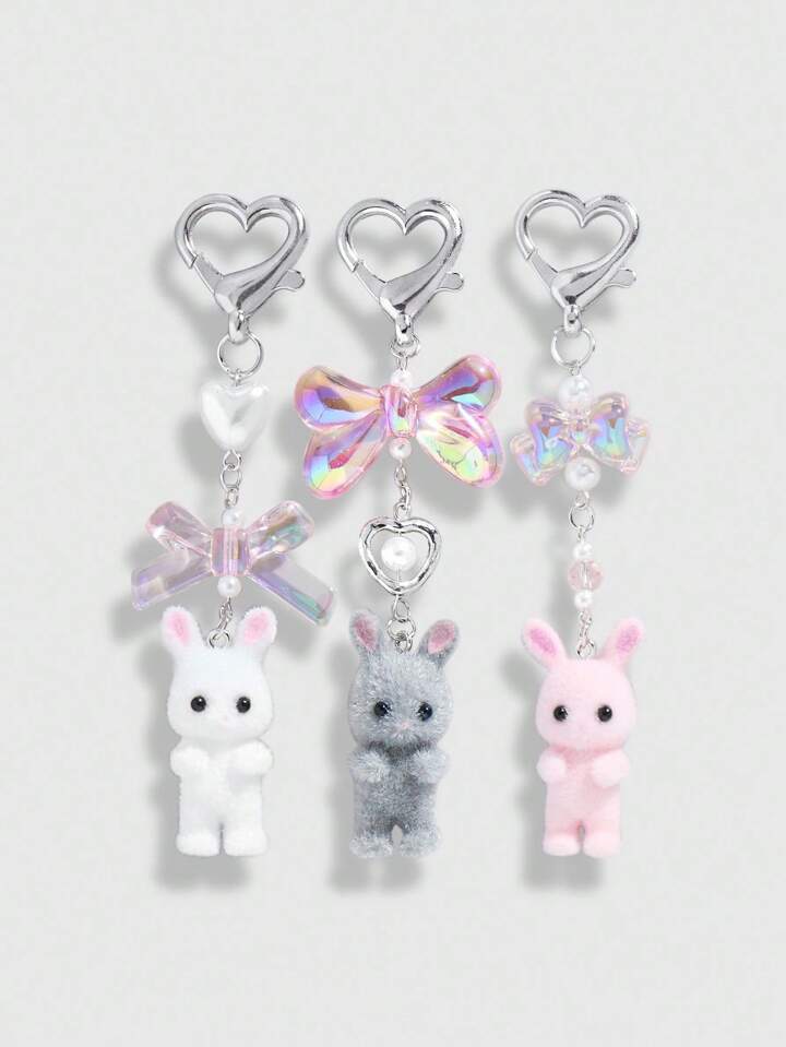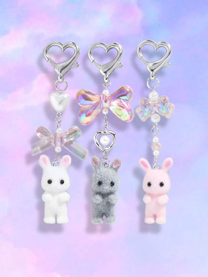 Kawaii Set de 3 llaveros con lazo translúcido rosa, perla falsa blanca y conejo gris/blanco/rosa con estampado, un accesorio de moda y delicado, adecuado para uso diario y regalos del Día de San Valentín para mujeres