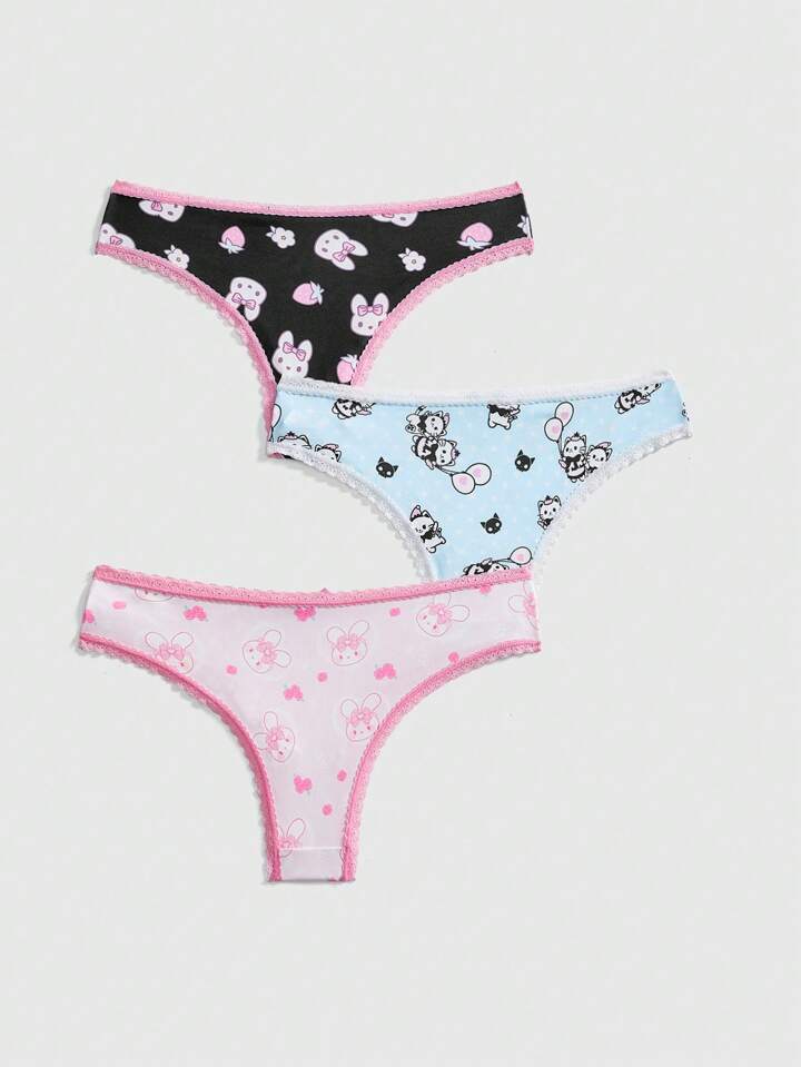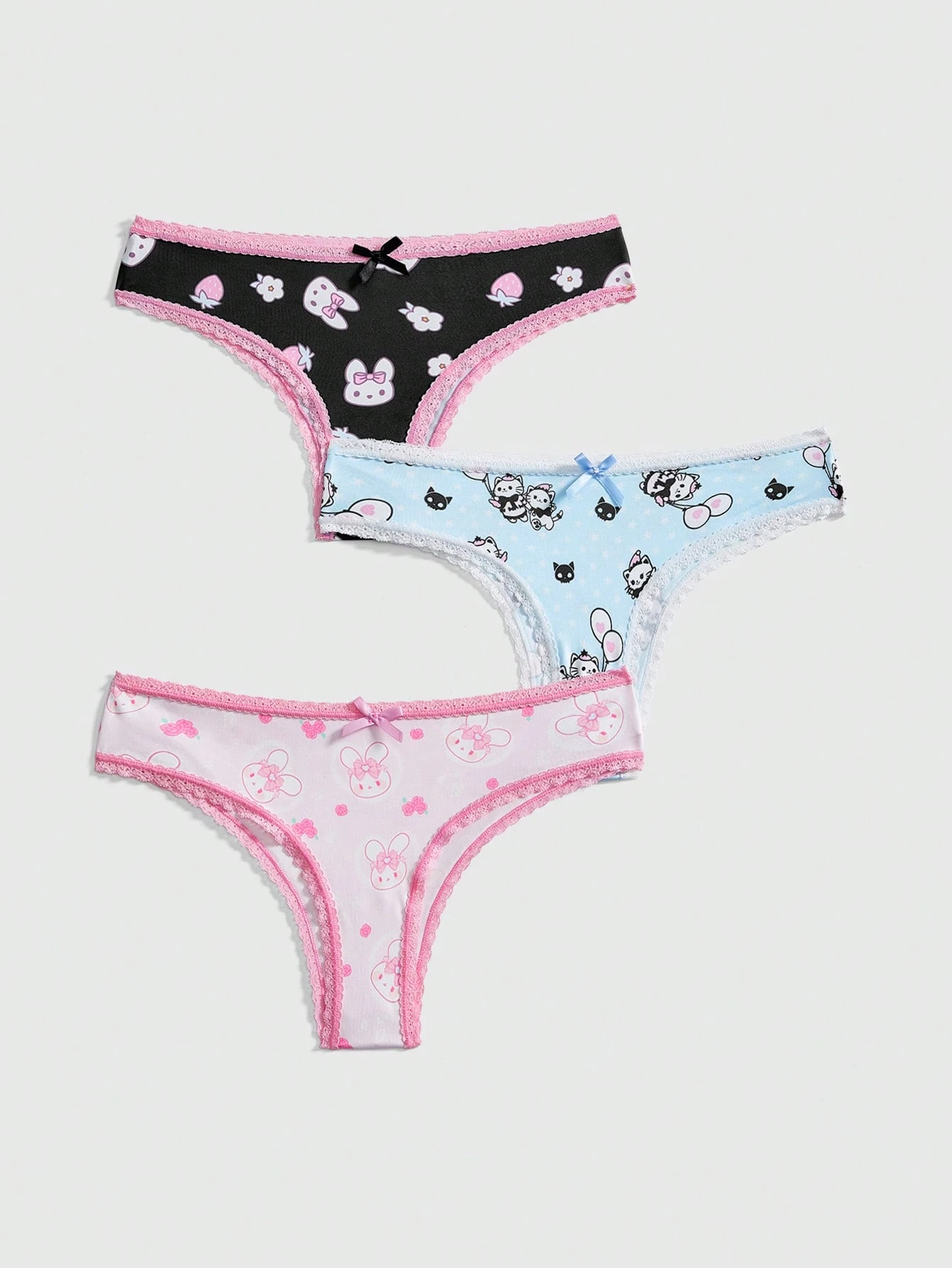 Kawaii Set de 3 pantis con encaje y estampado de gatitos y conejos lindos para mujeres