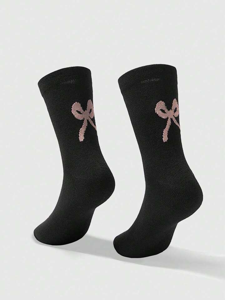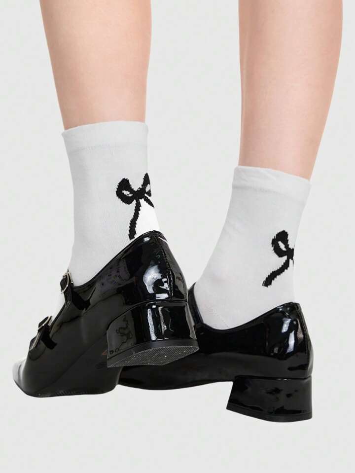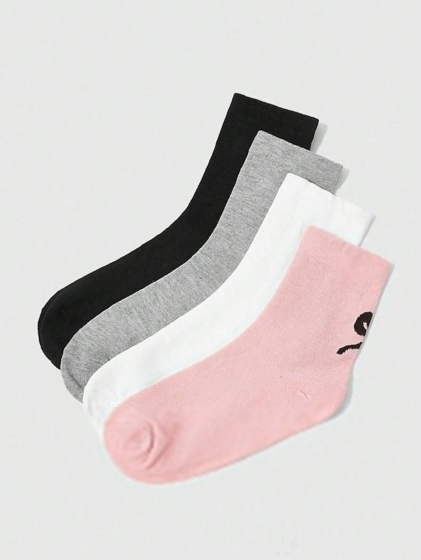 Kawaii 4 pares de calcetines de media pantorrilla con detalle de tacón con lazo, en colores negro, blanco, gris y rosa