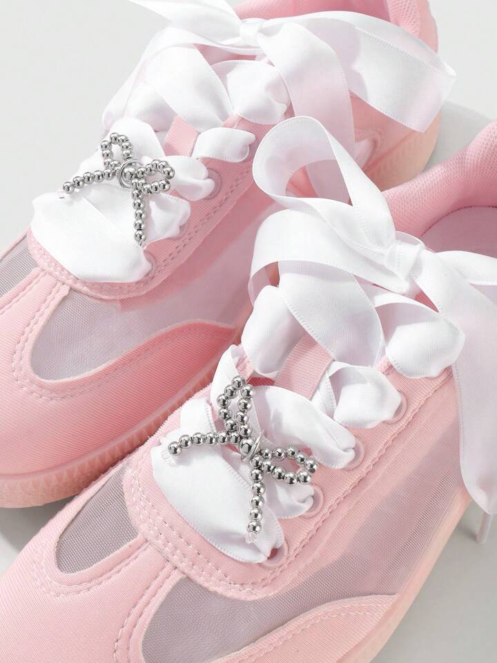 Kawaii Set de 4 piezas de cordones de satén blancos planos, elegantes y versátiles, además de decoración para zapatos/botas con cuentas hechas a mano de CCB acrílico en forma de lazo, adecuado para el uso diario de mujeres y niñas, y como regalo para festivales