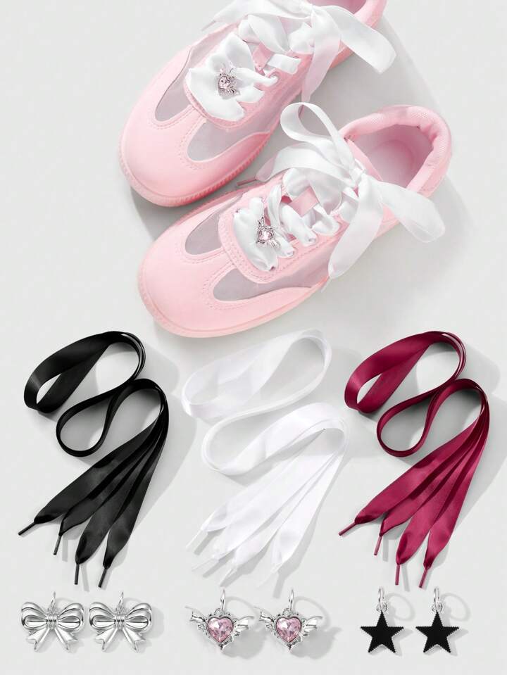 Kawaii 6 pares de cordones planos y anchos con estilo Y2K y vibra gótica, decorados con corazones de cristal, estrellas y lazos, en colores negro, rojo y blanco, adecuados para hermanas, amigas y uso diario, también como regalo para festivales