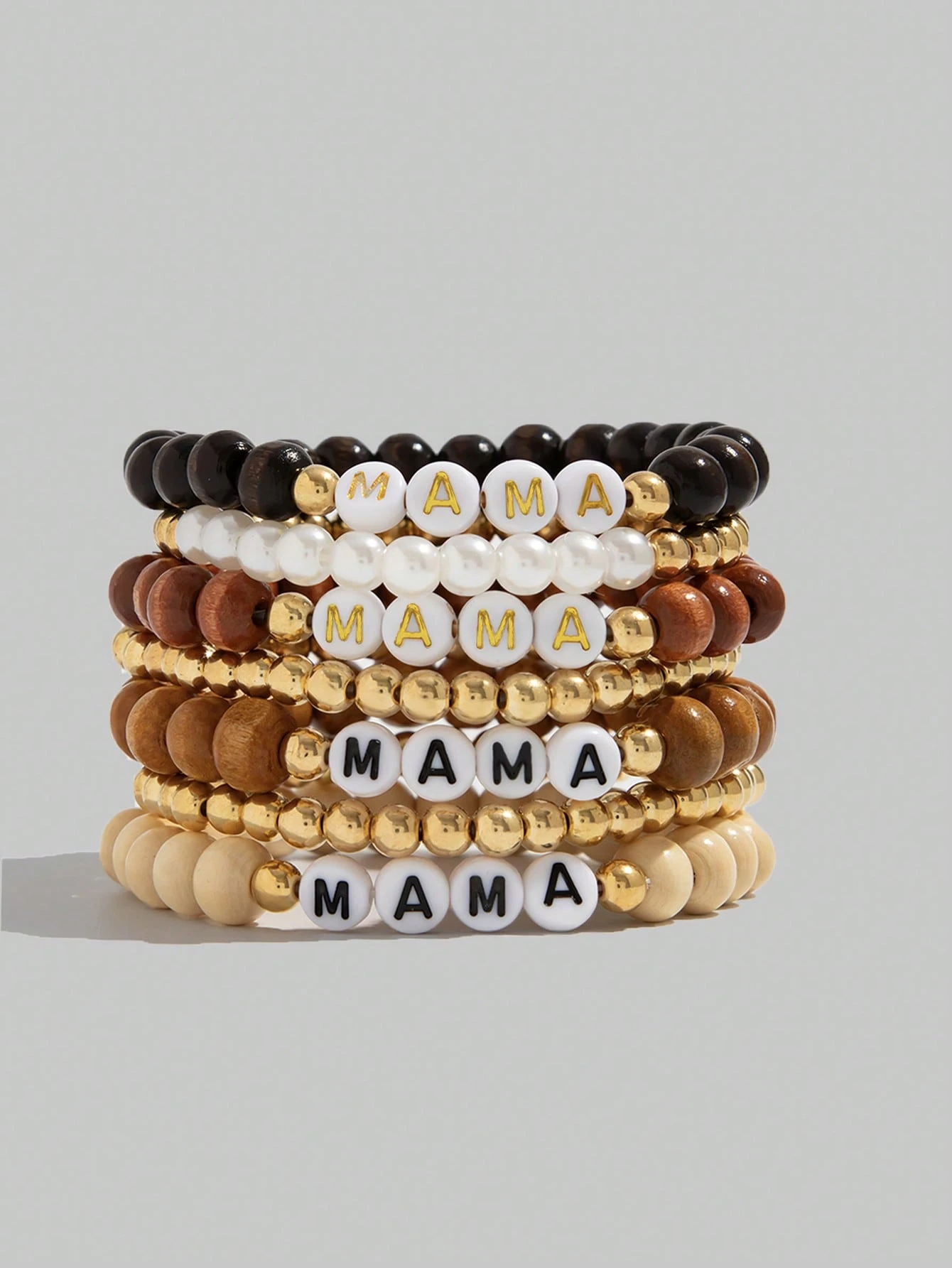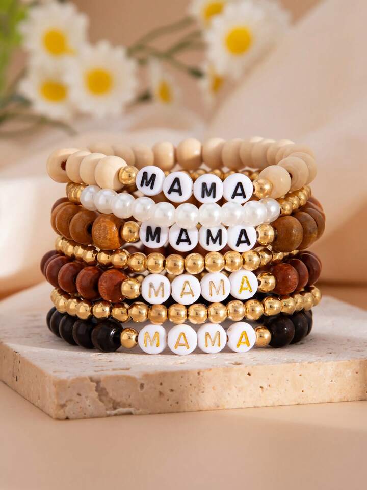 Kawaii Set de 7 pulseras minimalistas con cuentas que dicen "MAMA", joyas de moda casual para mujeres, regalo para el Día de la Madre