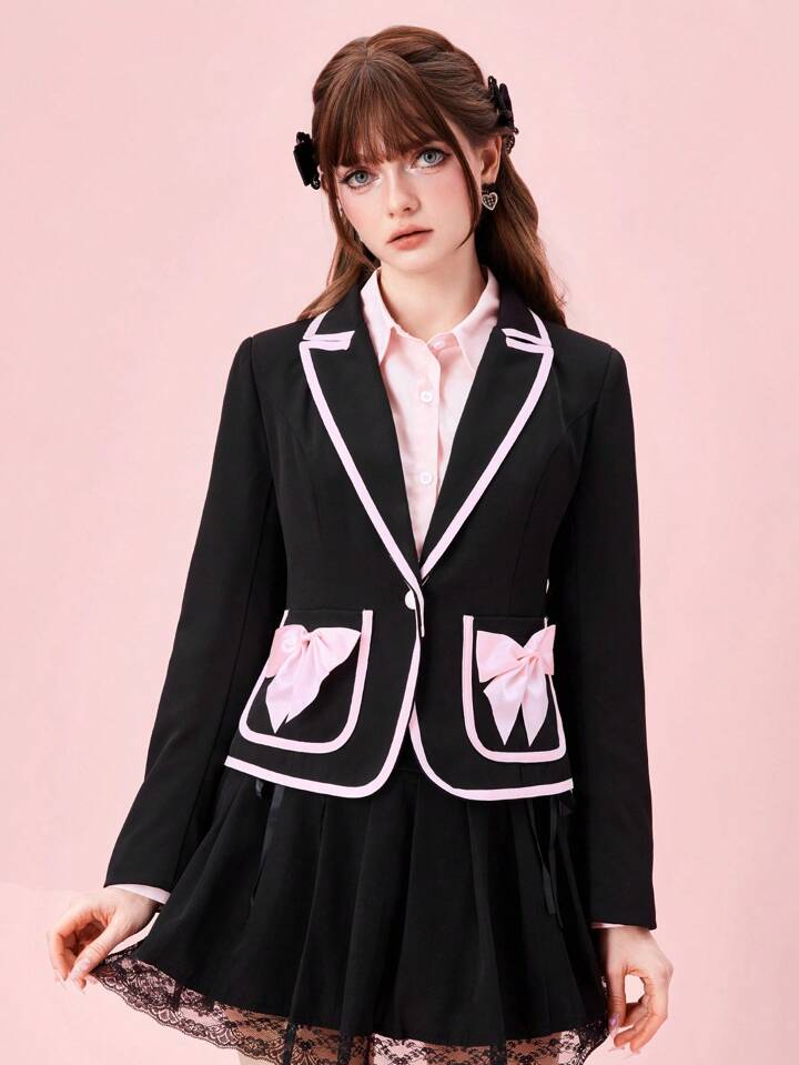 Kawaii Blazer para mujer con acento de lazo estilo universitario estadounidense, ribete rosa, para la escuela