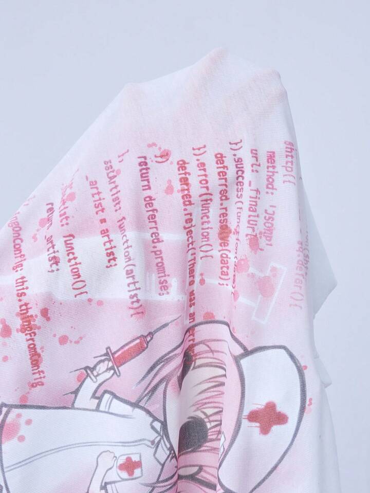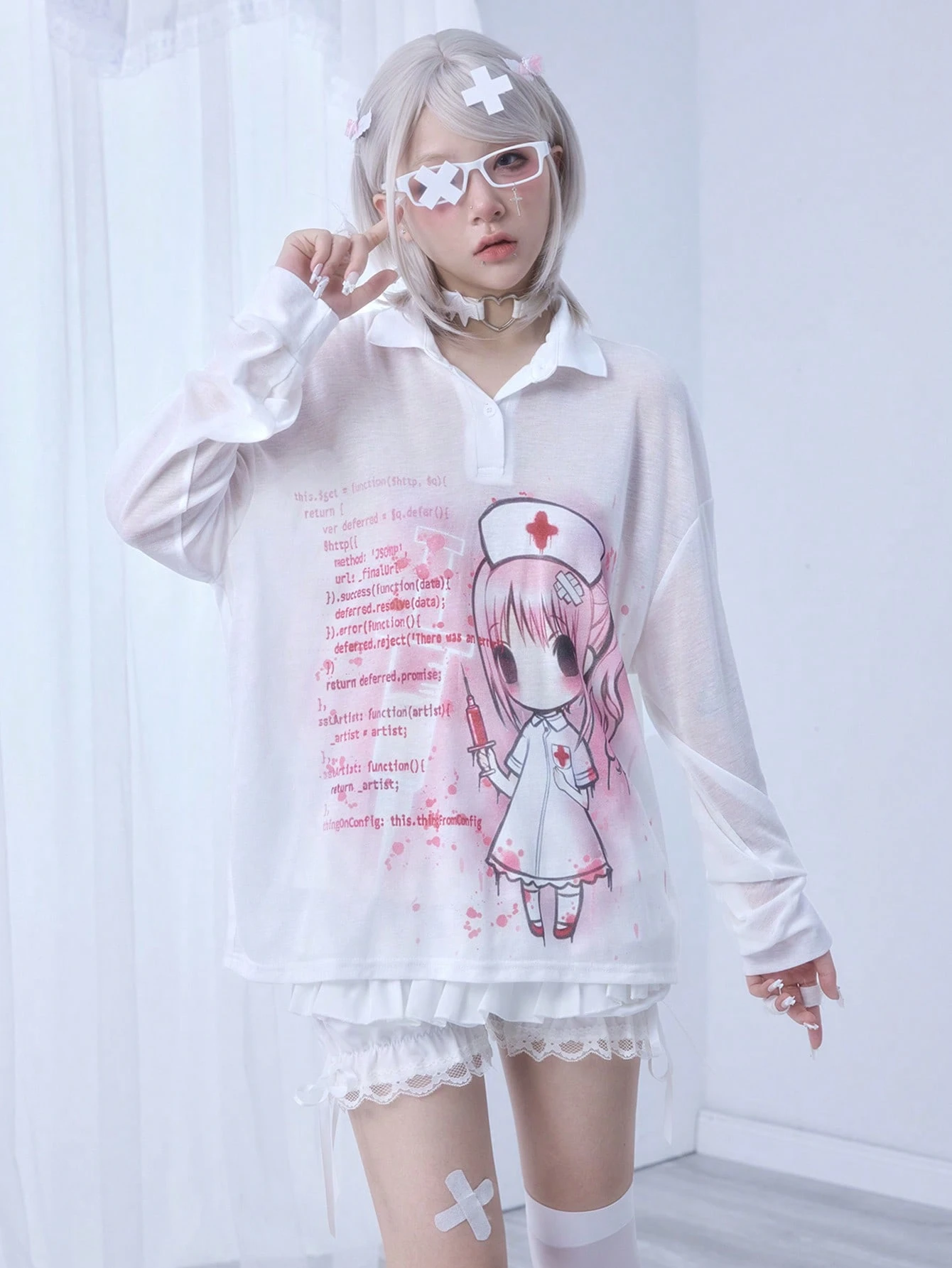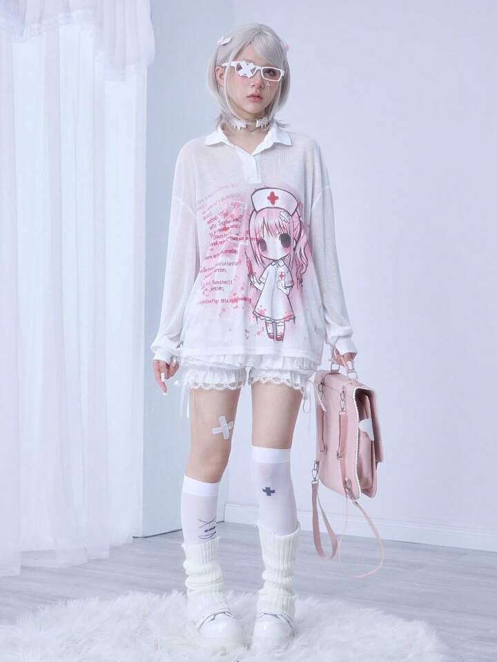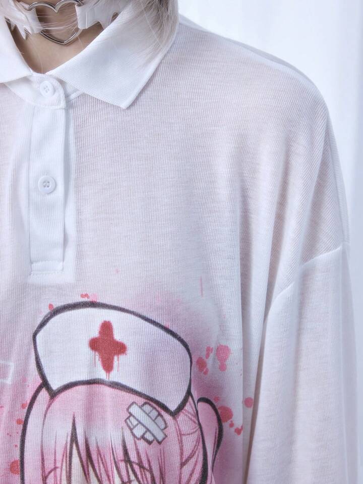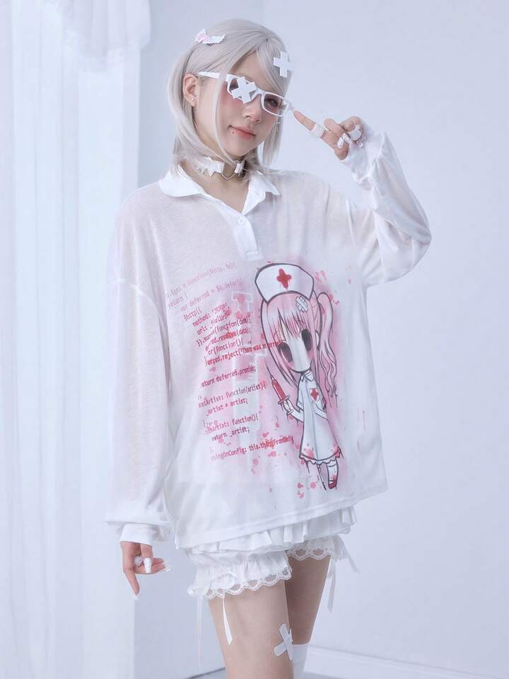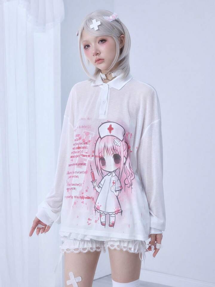 Kawaii Blusa de manga larga con cuello, cómoda y ligera, con estampado de jeringa y código de enfermera de anime