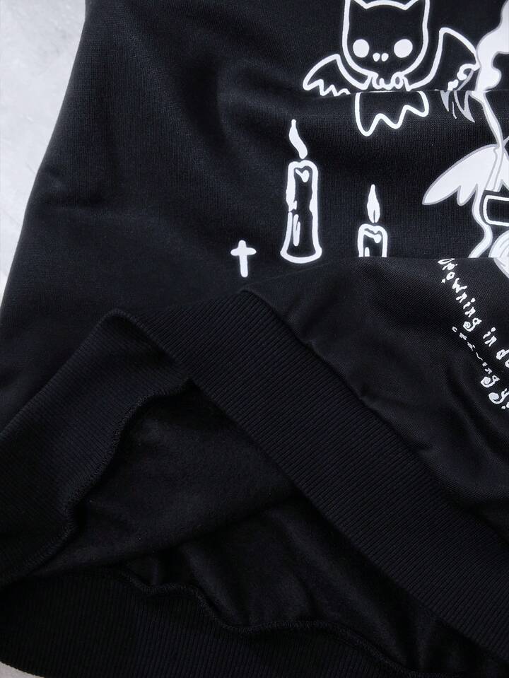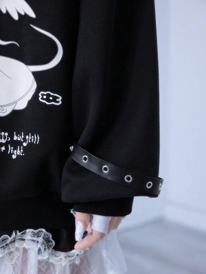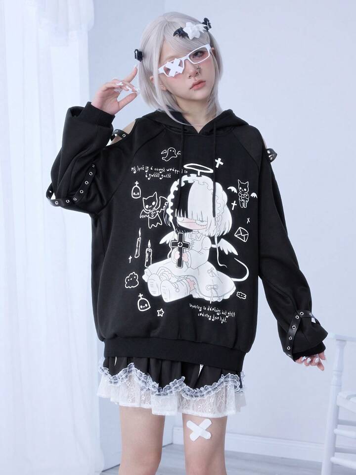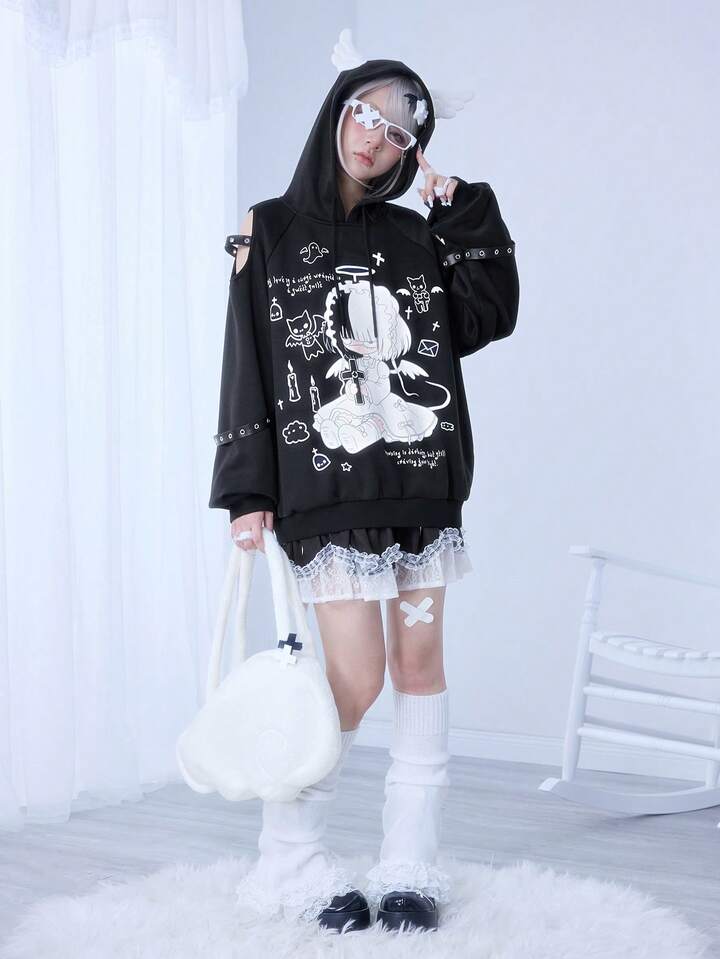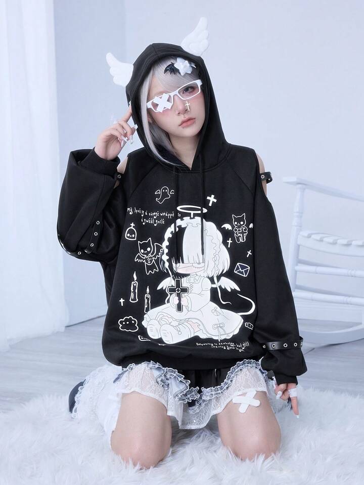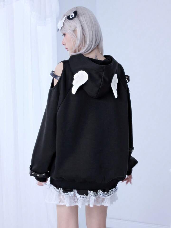 Kawaii Sudadera con capucha con alas de ángel, corte en el hombro y cruz de enfermera de estilo anime Yandere