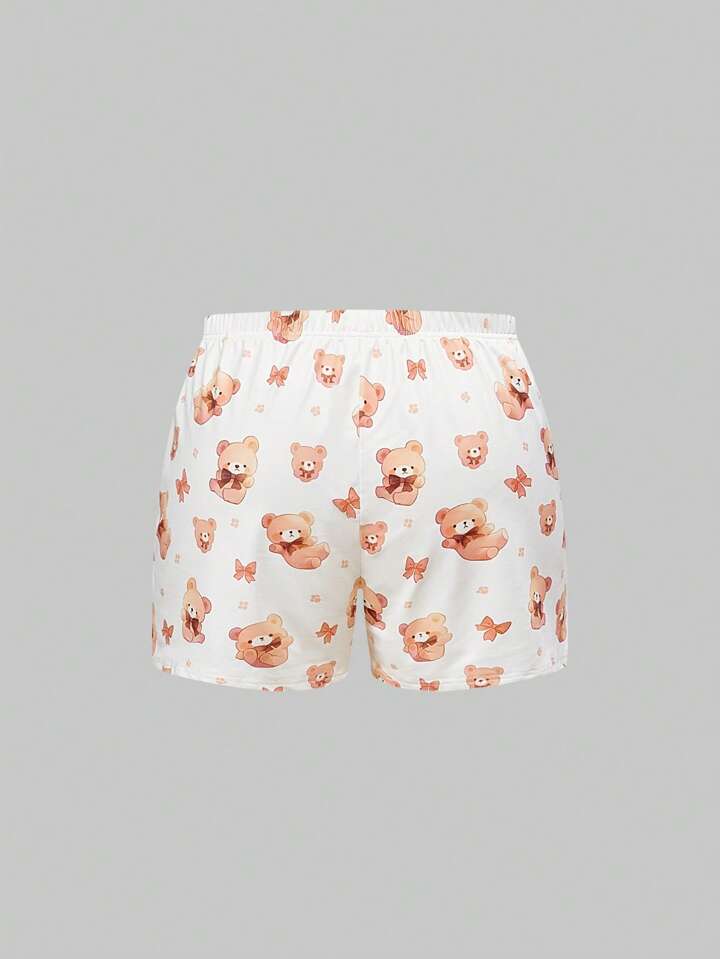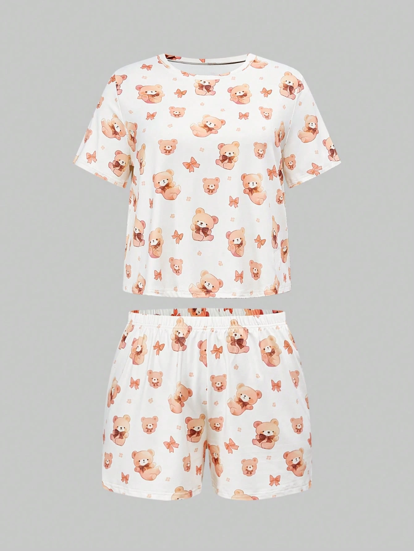 Conjunto de pijama de shorts y manga corta talla grande con estampado de oso y moño estilo Kawaii