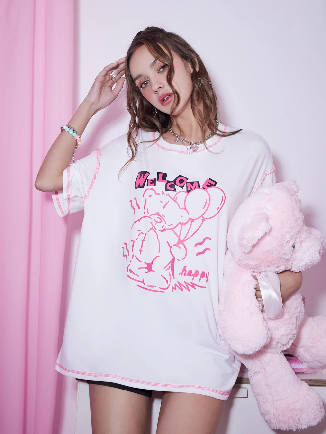 Kawaii Camiseta con puntada con estampado de oso y letra