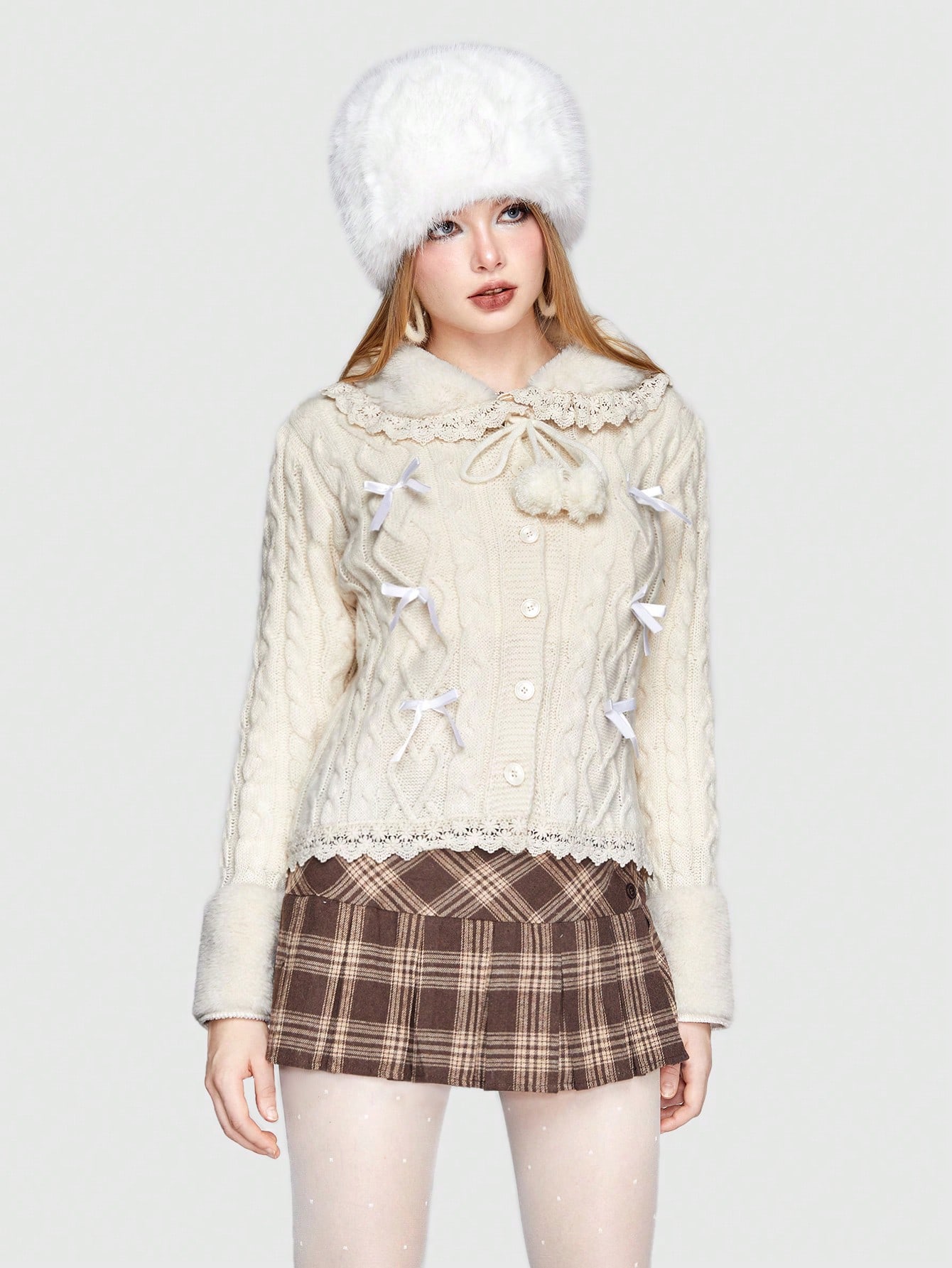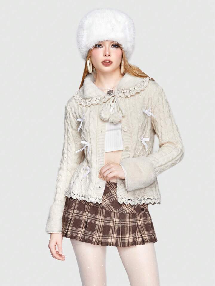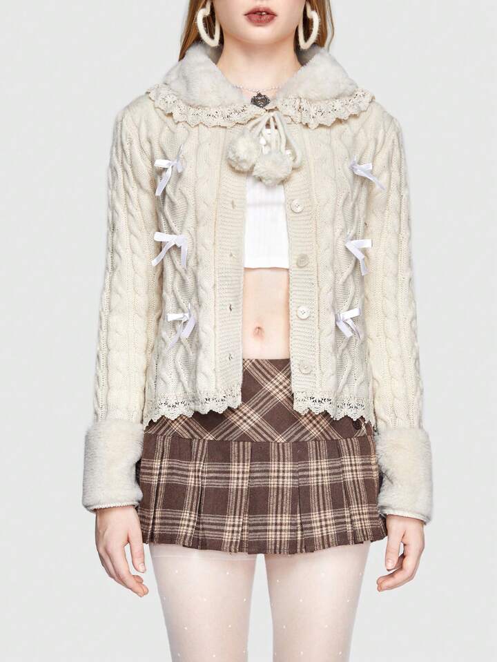 Kawaii Cárdigan con diseño de lazo con botón delantero ribete con encaje en contraste tejido de cable