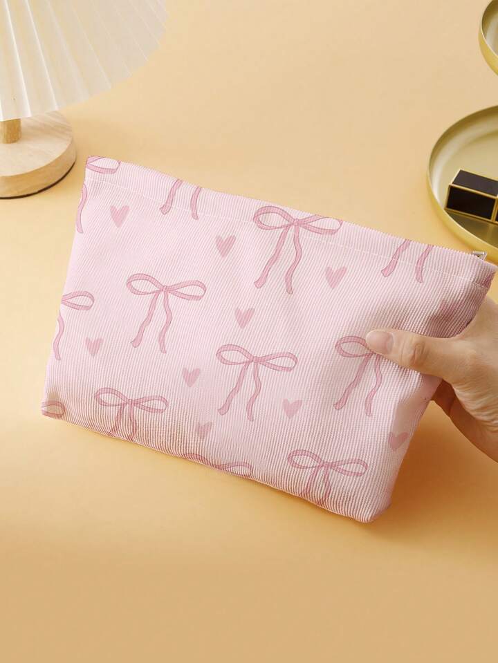 Kawaii Bolso de cosméticos de pana con patrón de lazo impreso a doble cara