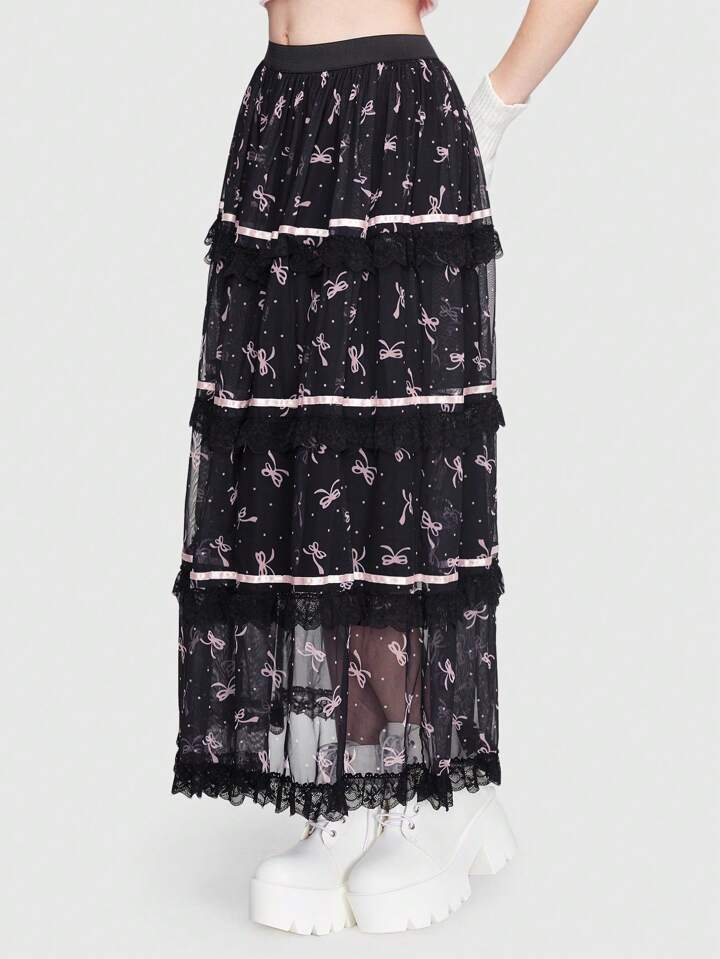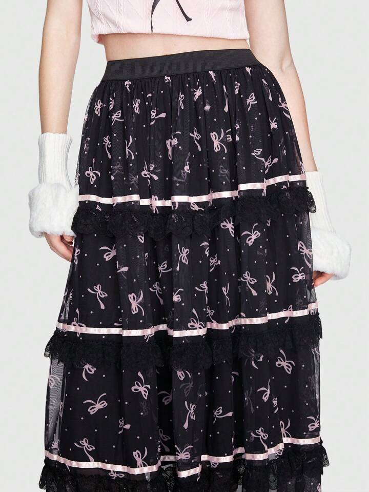Kawaii Falda con estampado de lazo ribete con encaje con malla