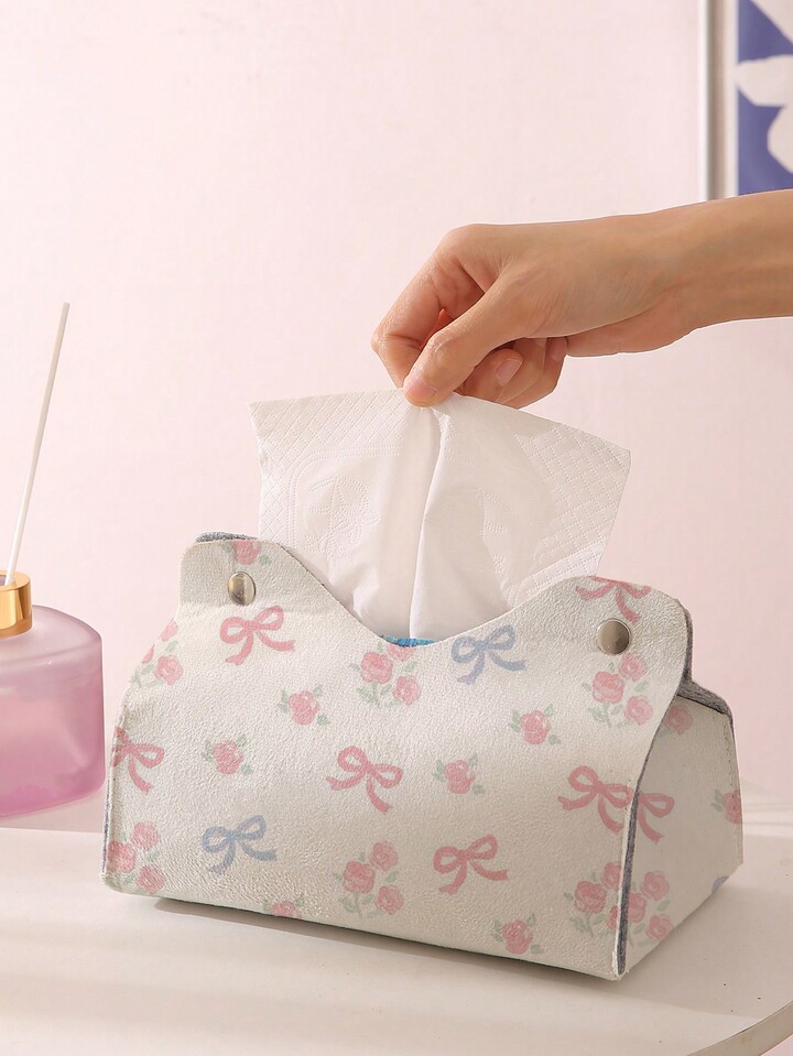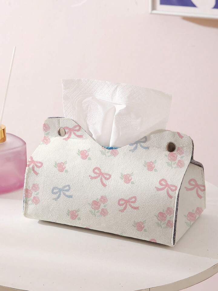 Kawaii Caja de almacenamiento de pañuelos con diseño impreso de rosas y mariposas con cubierta de lazo