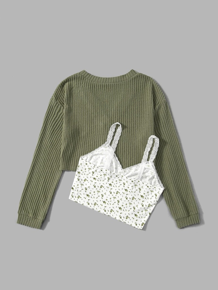 Kawaii Camiseta con botón delantero & Top de tirantes floral