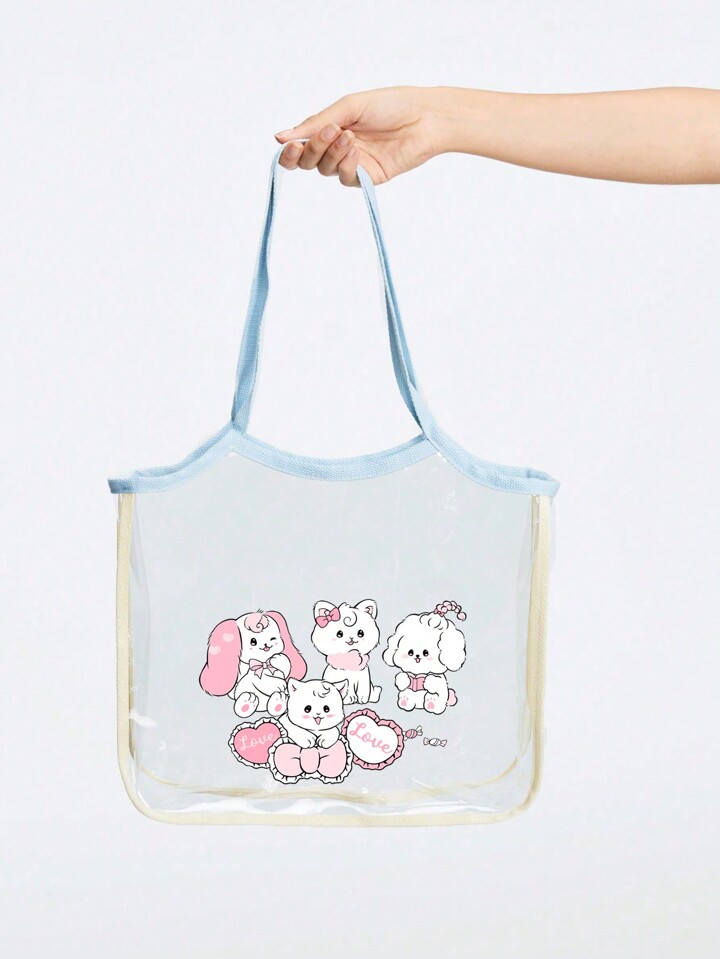 Kawaii Bolso de compras impreso con dibujo de perro, bandolera y bolso transparente para la playa con diseño de bloque de color, bolsa de hombro y bolsa de natación
