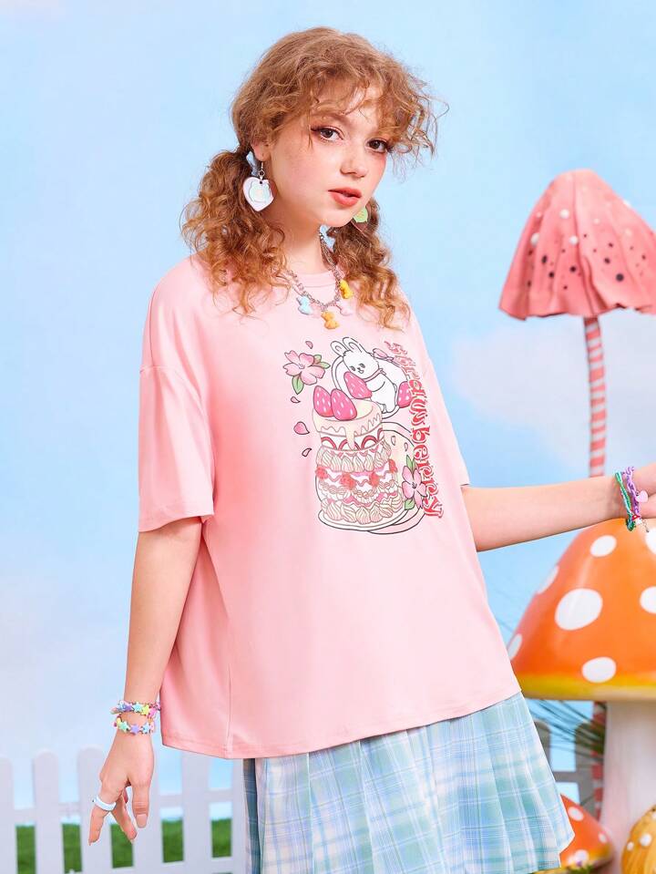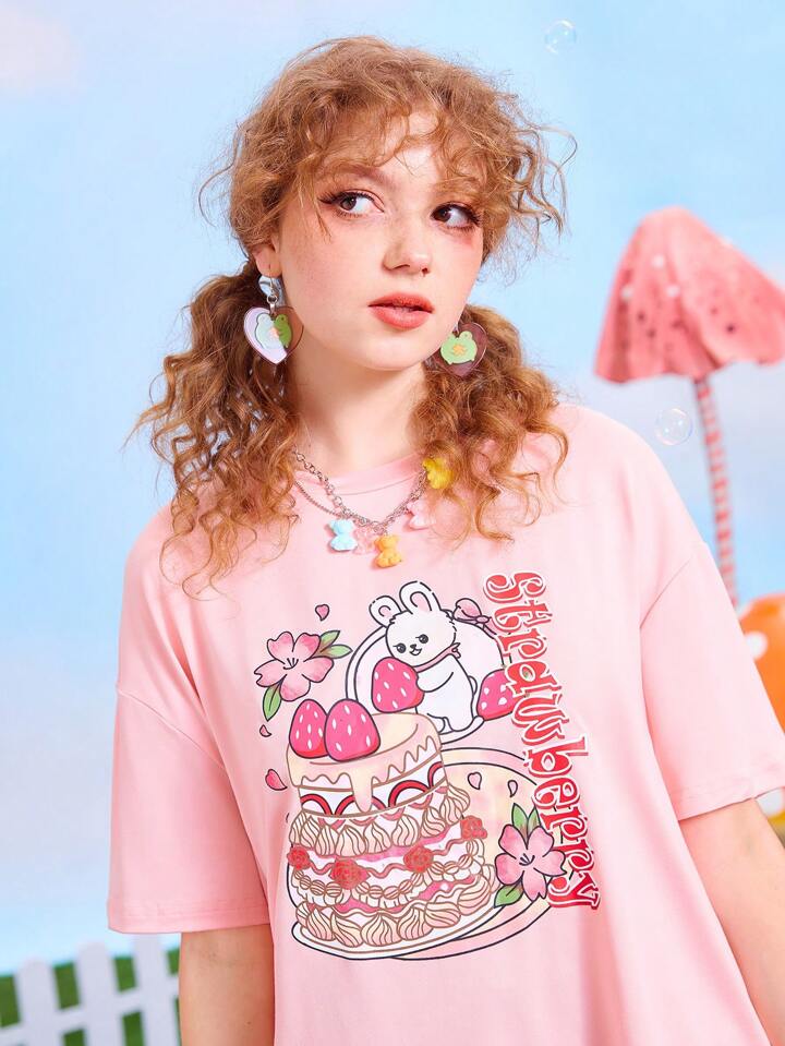 Kawaii Camiseta de hombros caídos con estampado de dibujos animados