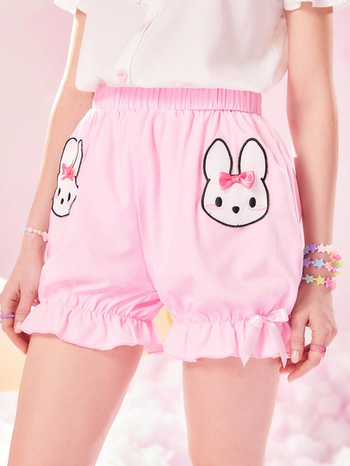 Kawaii Shorts con estampado de dibujos animados bajo con fruncido con diseño de lazo