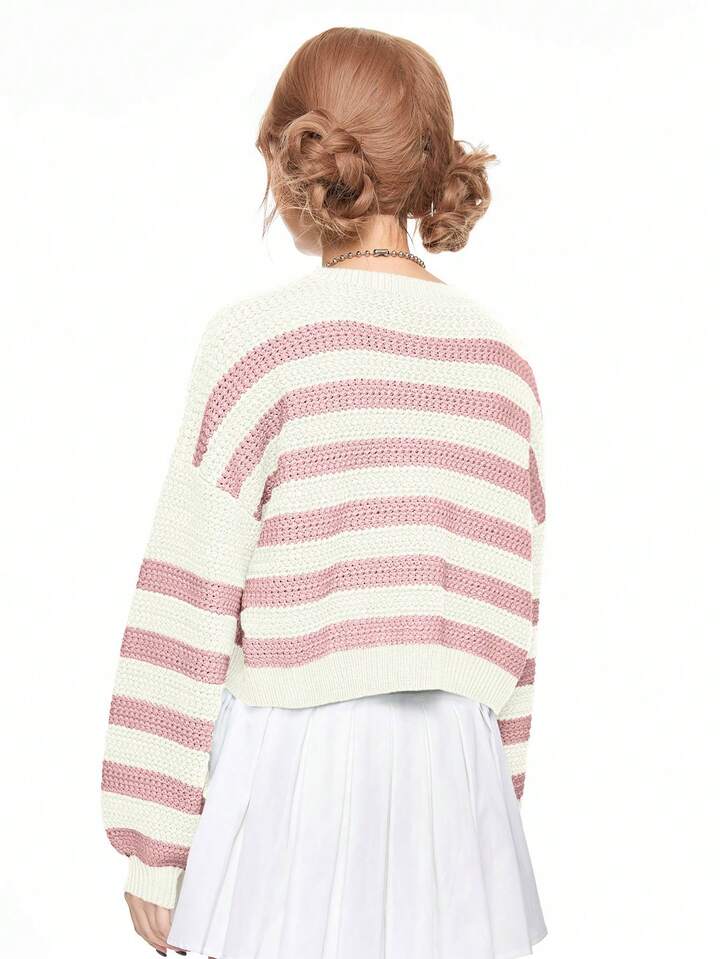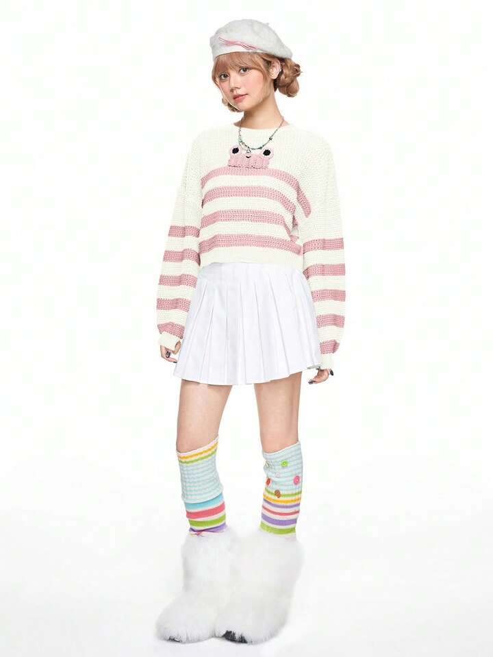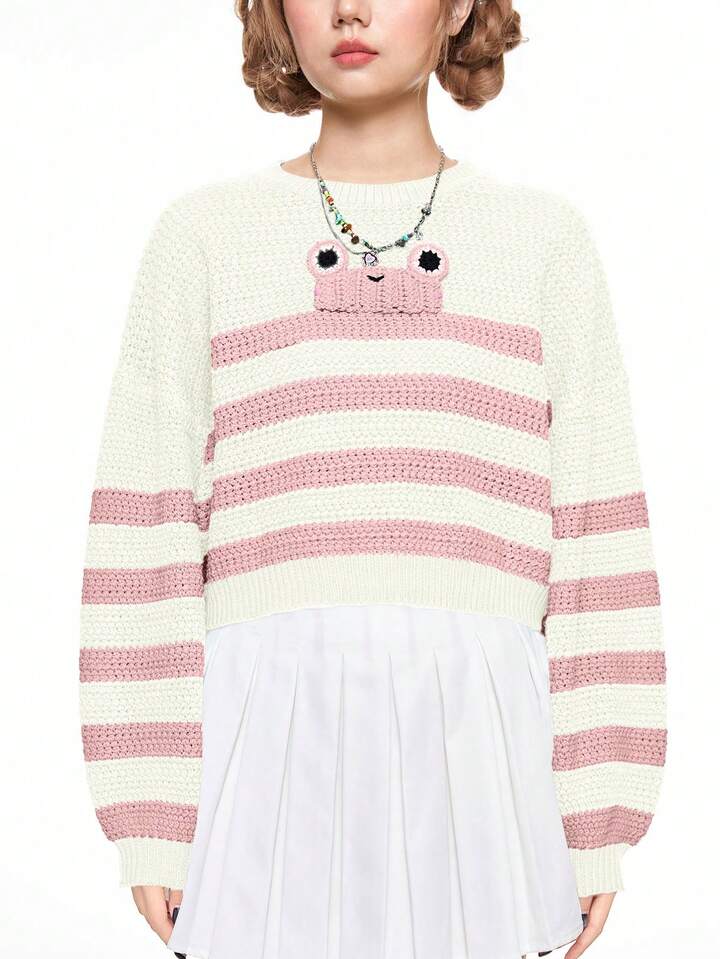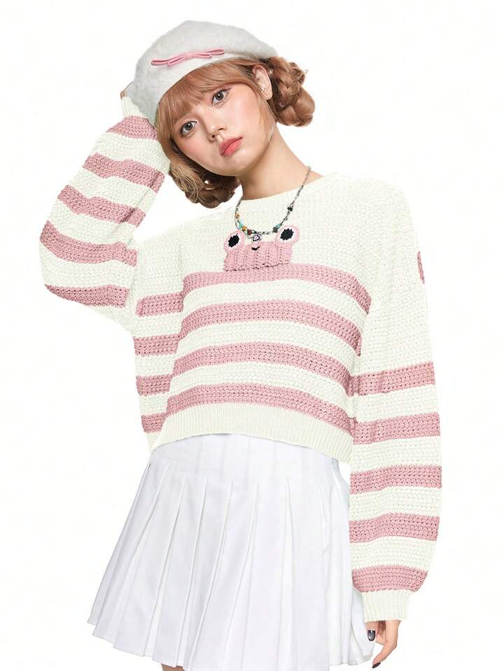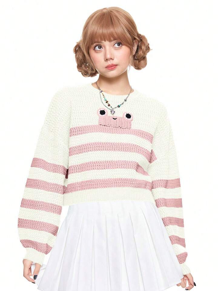 Kawaii Suéter holgado de mujer con estampado de rayas y rana