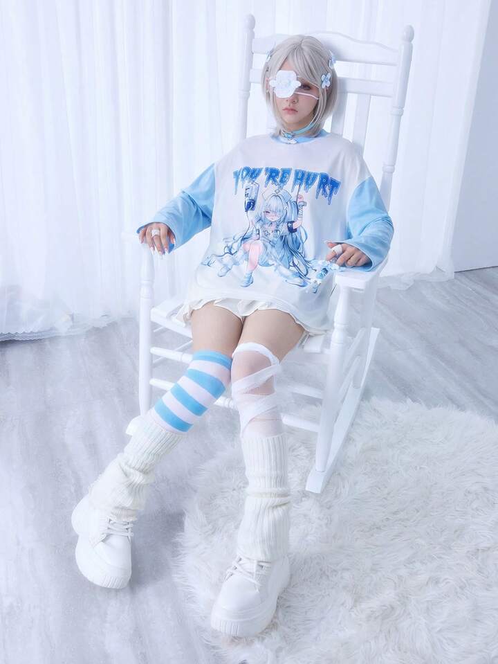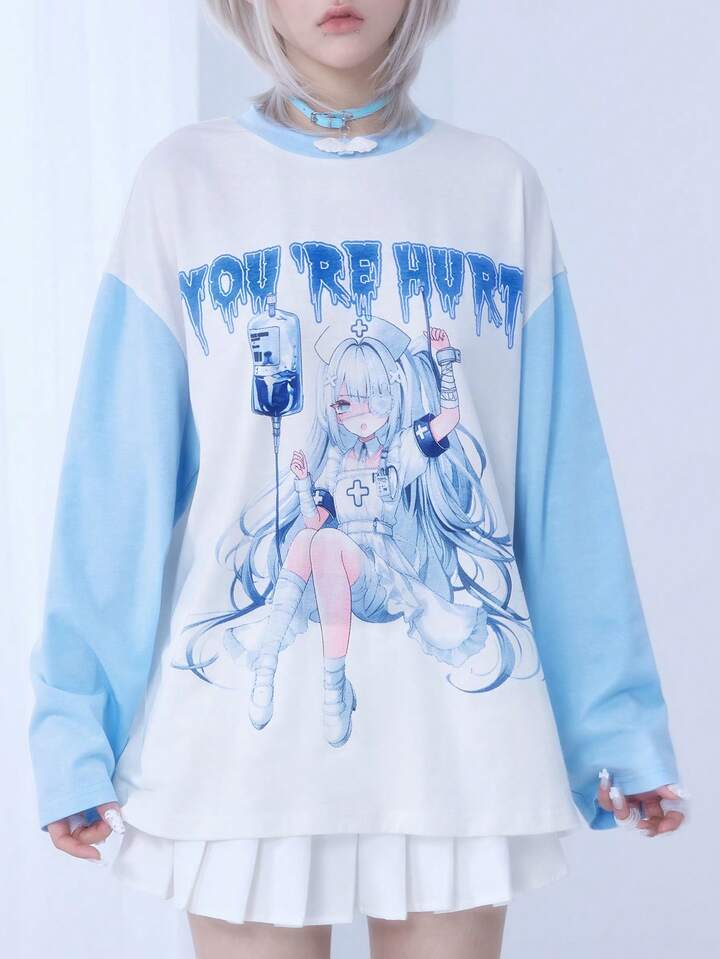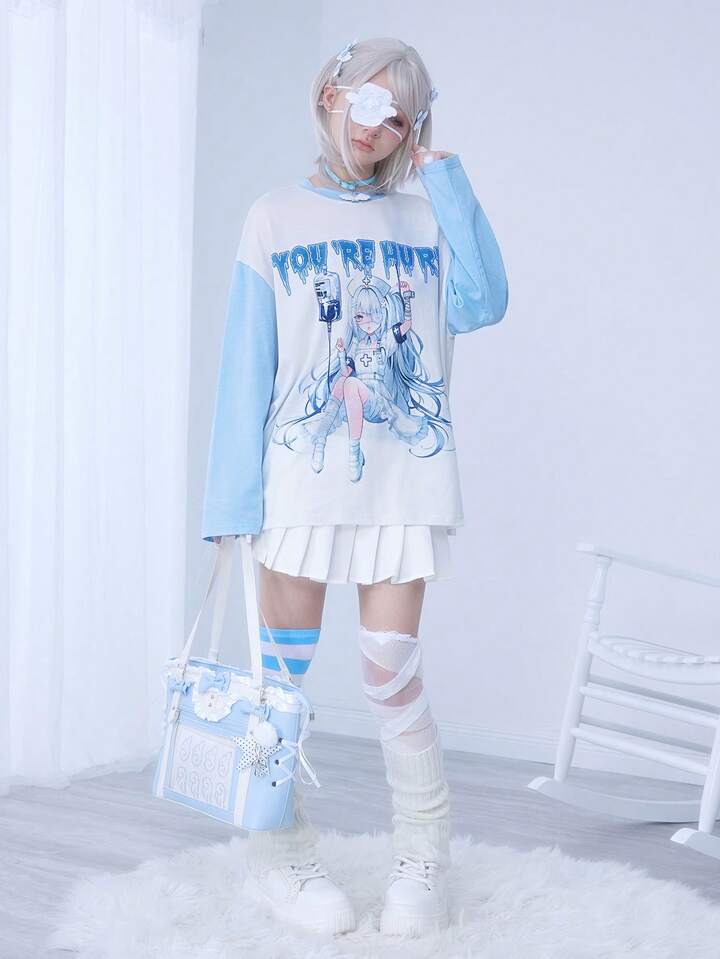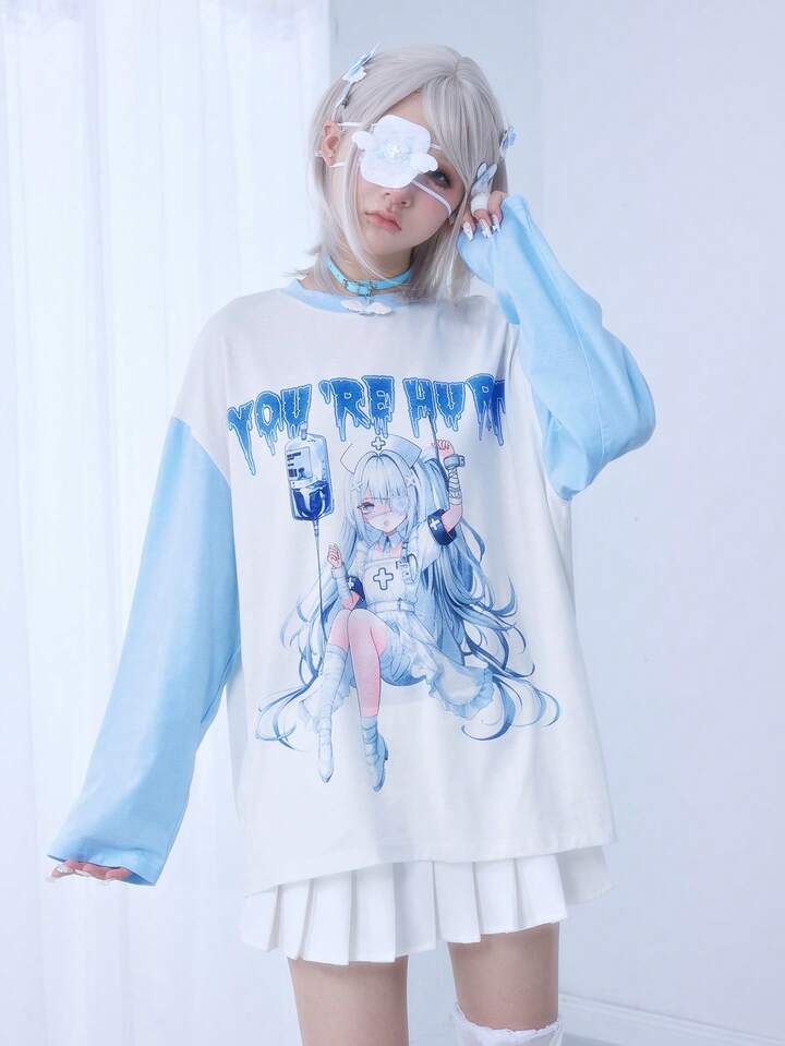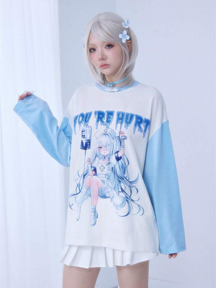 Kawaii Camiseta de manga larga de ajuste holgado y casual para mujer, estilo de enfermera de anime japonés