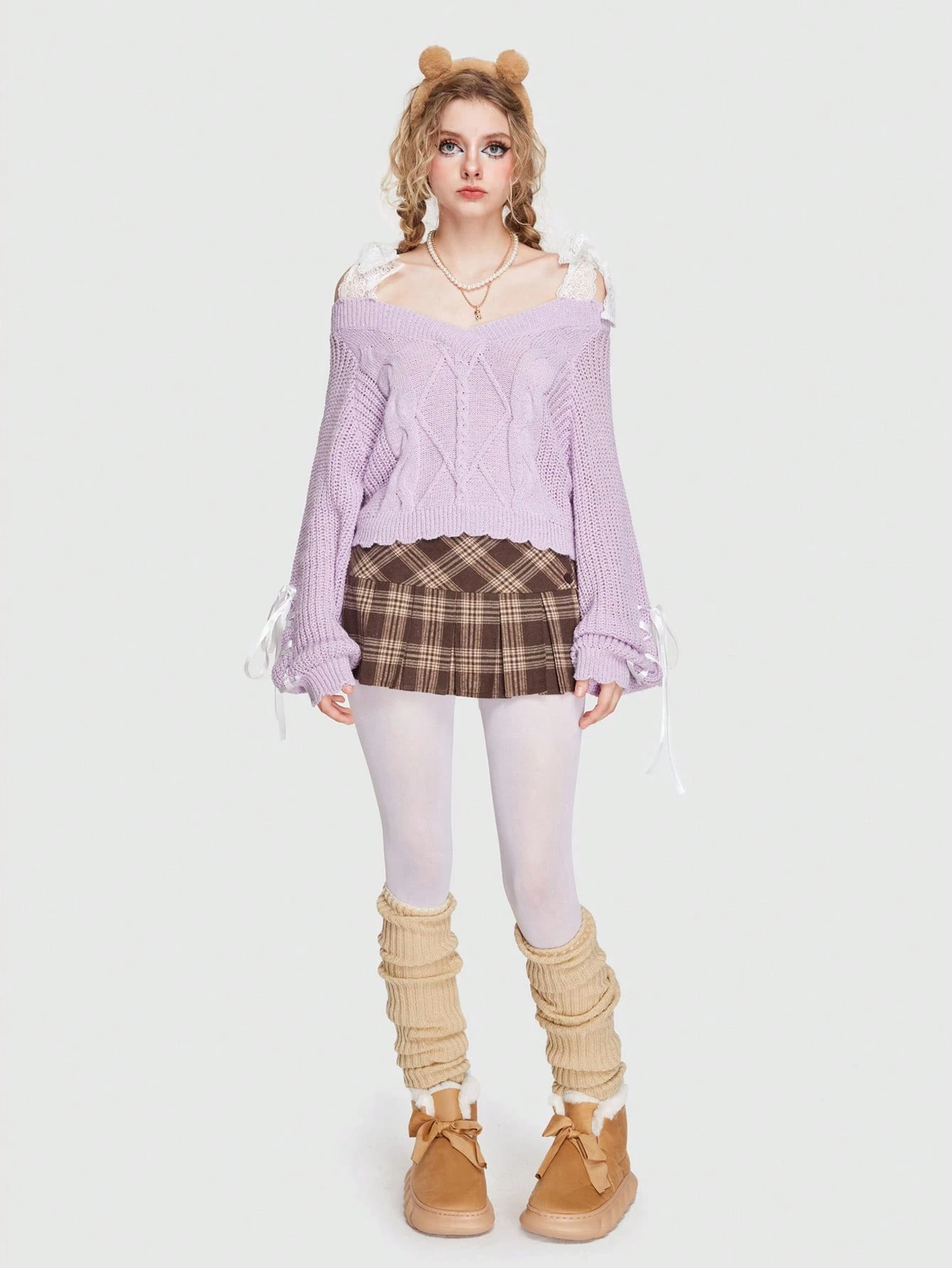 Kawaii Jersey de hombros descubiertos amarre en manga tejido de cable