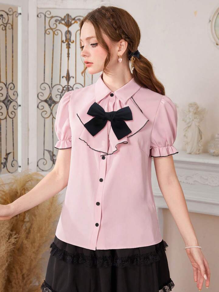 Kawaii Camisa unido en contraste con lazo delantero de manga farol