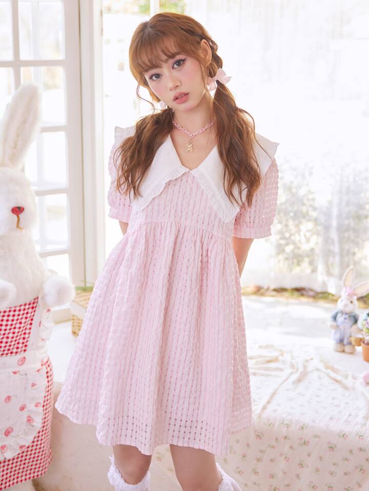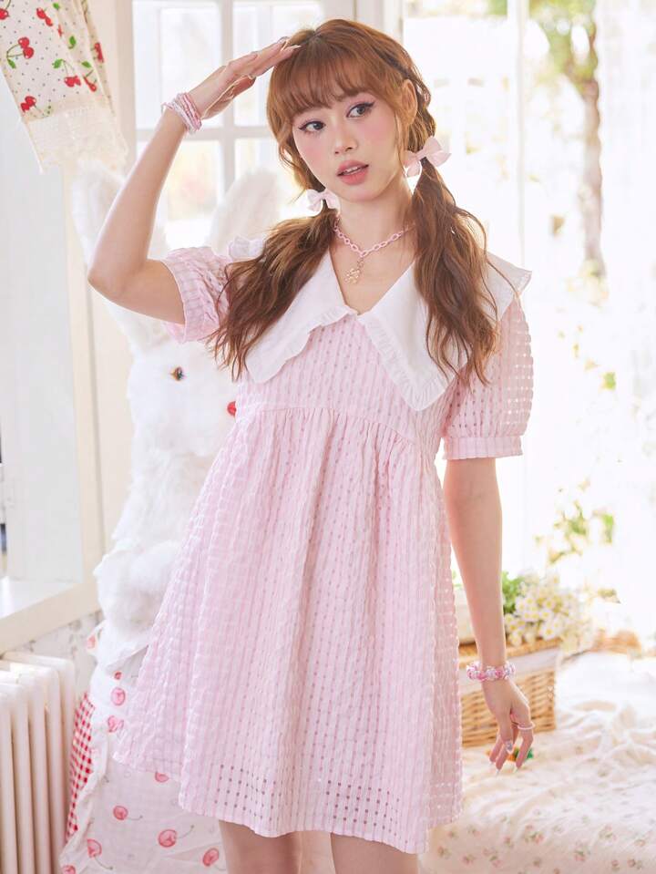 Kawaii Vestido smock de cuello en contraste de manga farol
