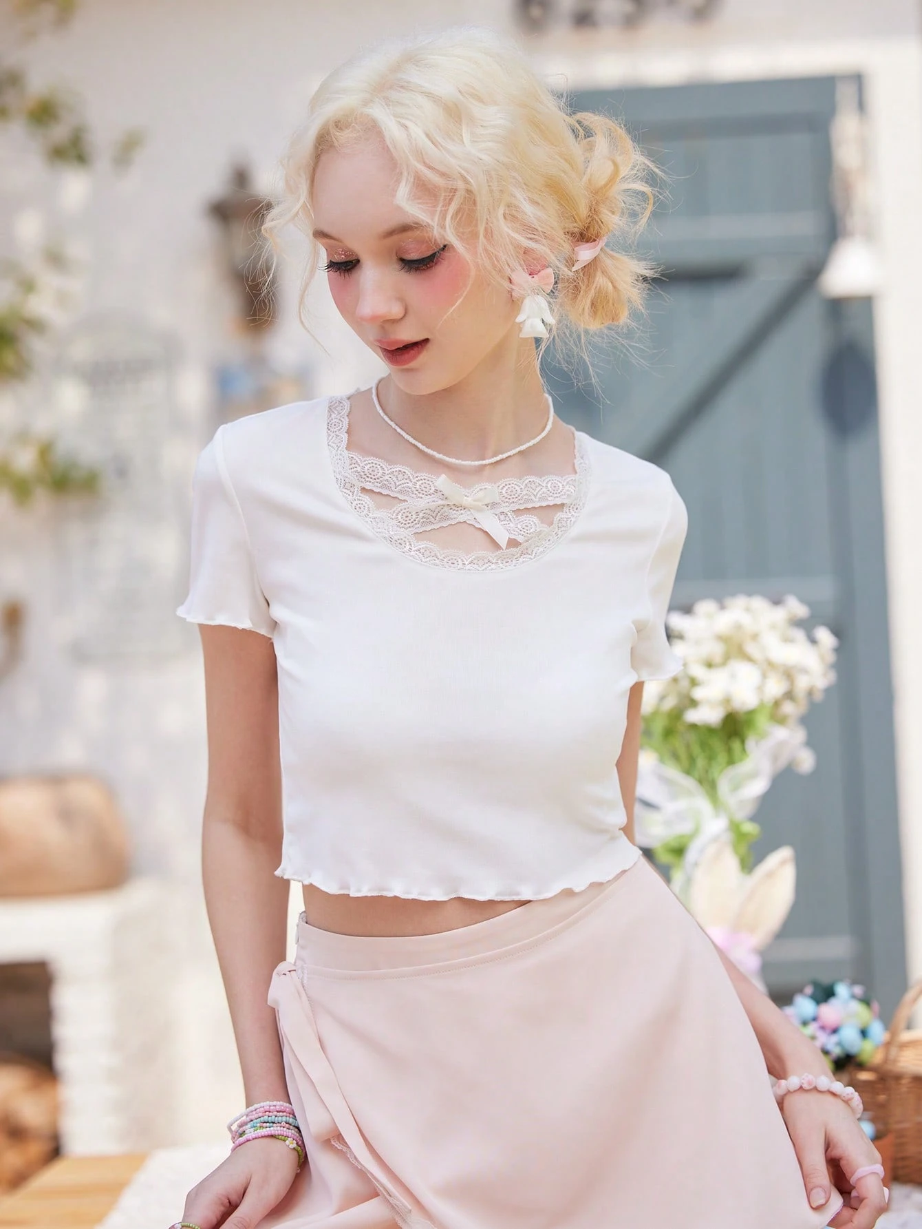 Kawaii Camisetas de Mujer Encaje en contraste Acaracolado Liso Casual