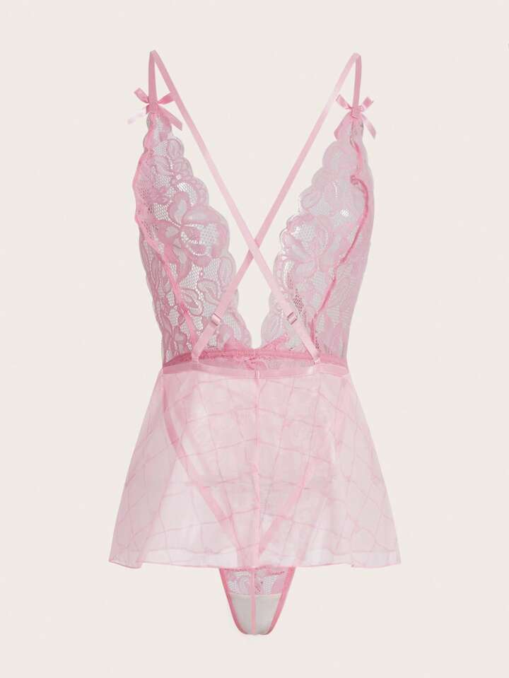 Kawaii Body teddy con encaje en contraste con tira cruzada con diseño de lazo