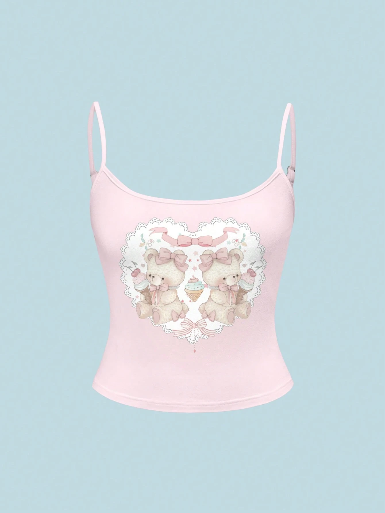 Kawaii Camiseta de tirantes rosa para dama con diseño de oso ángel, pastel y corazón