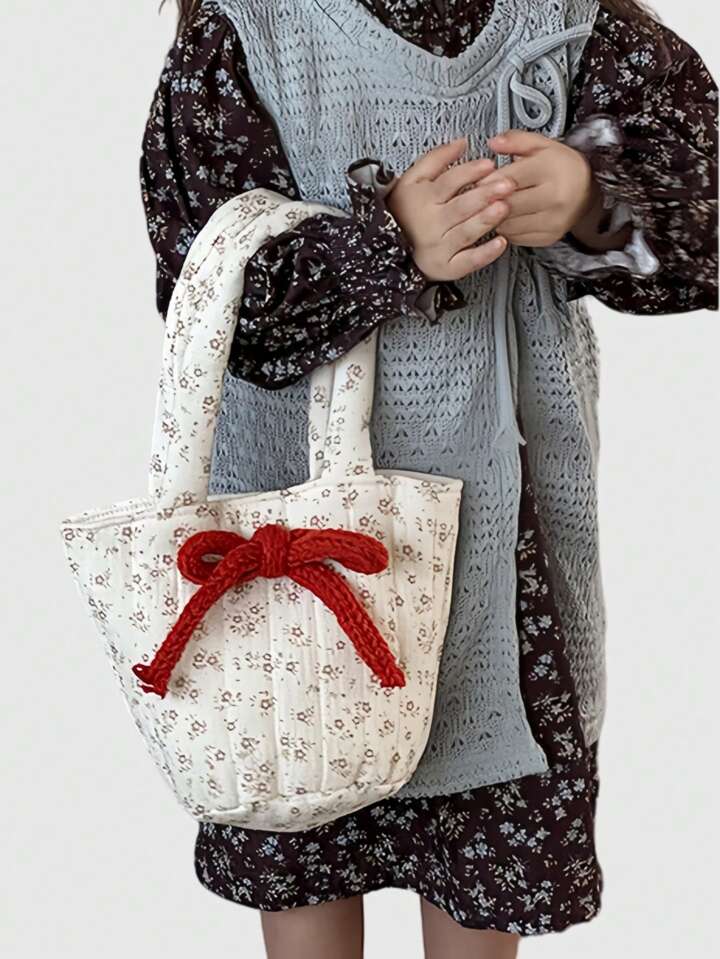 Kawaii Bolso de mano de mujer con estampado de lazo y flores, bolso tipo cubo informal para niños en San Valentín