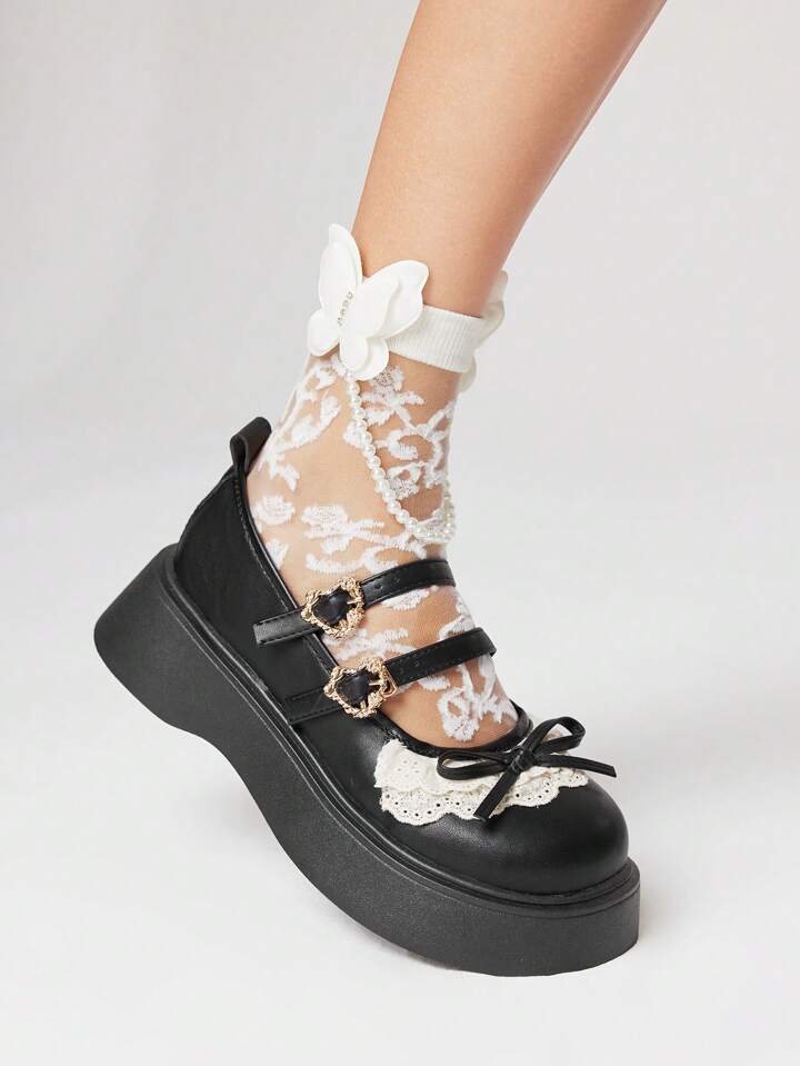 Kawaii Zapatos de tacón de estilo británico lindo con tacones de 4.5cm de grosor, color marrón, calados, correa con hebilla de doble corazón, adorno de lazo con encaje, forro cómodo