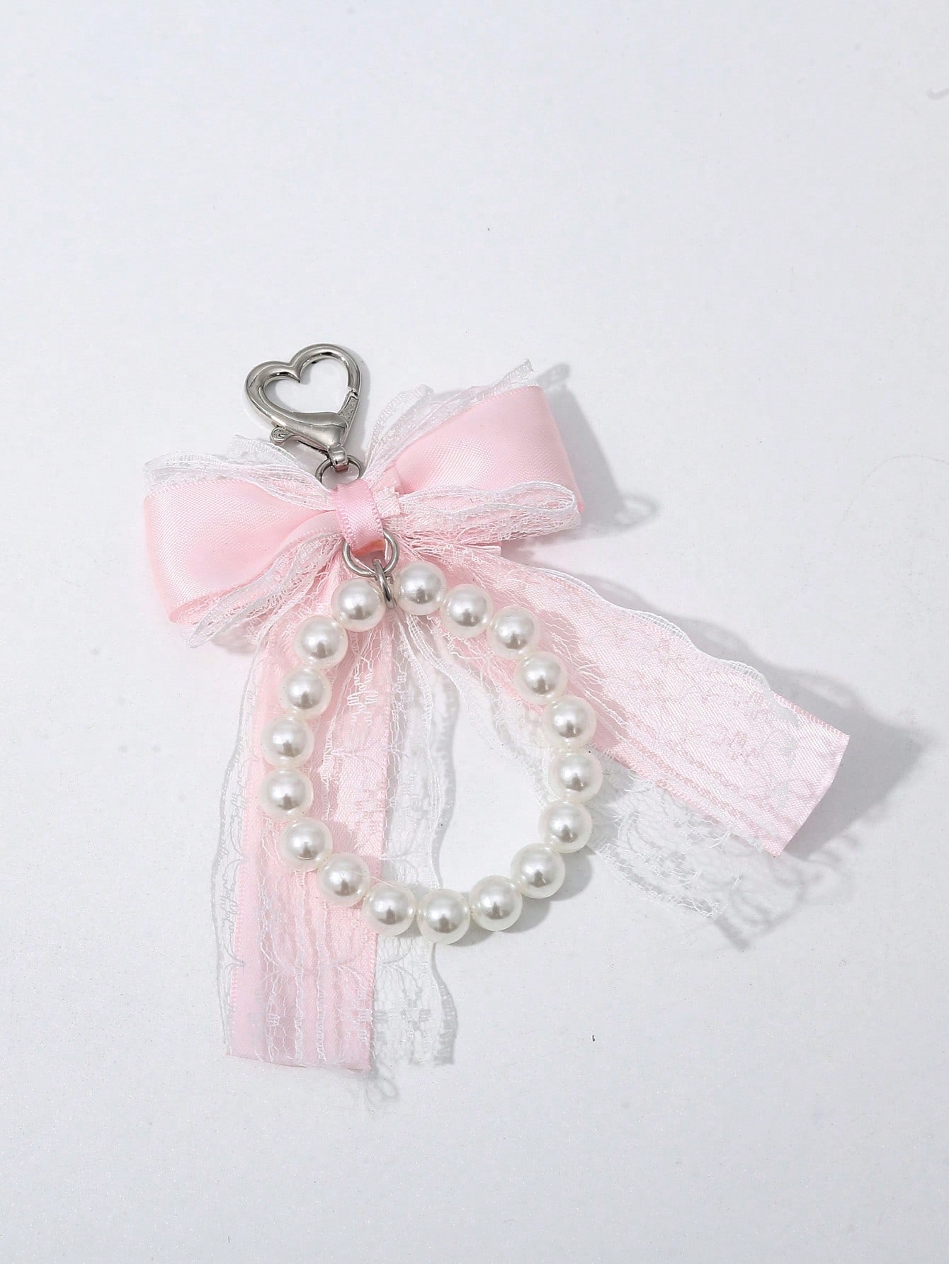 Kawaii Lindo colgante de bolso con forma de corazón, moño y perlas falsas