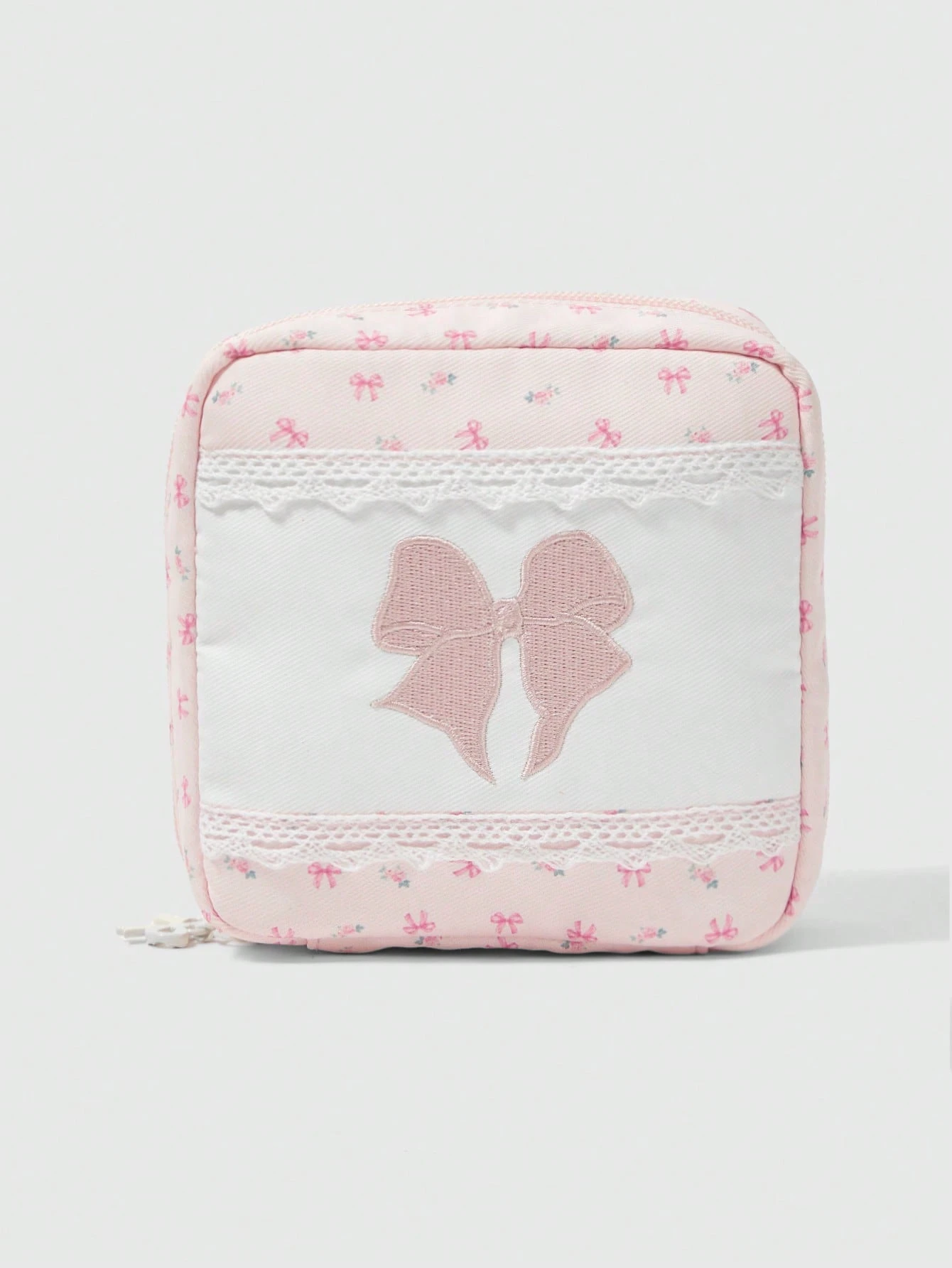 Kawaii Bolsa de maquillaje portátil con gran capacidad, acolchada y reforzada, con estampado de moño rosa y fresas, bolso cuadrado pequeño 401422