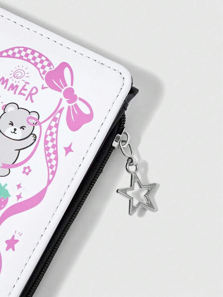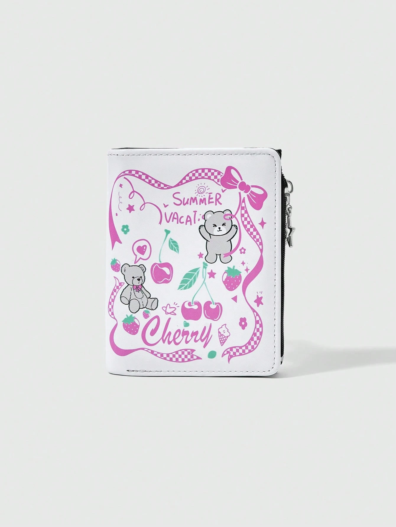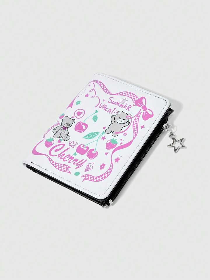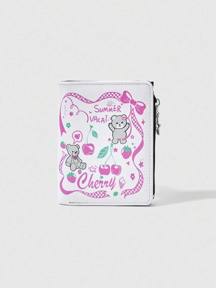 Kawaii Billetera corta multifuncional con múltiples ranuras para tarjetas, estampado de frutas y oso y lazo, de estrellas de cinco puntas con cremallera, elegante y casual para niñas