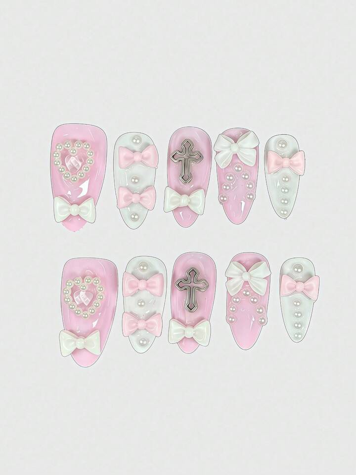 Kawaii Juego de uñas postizas rosas hechas a mano con decoraciones de patita de gatito, corazón romántico, lazo de bailarina, ala blanca y cruz de metal, adecuado para salidas diarias y citas
