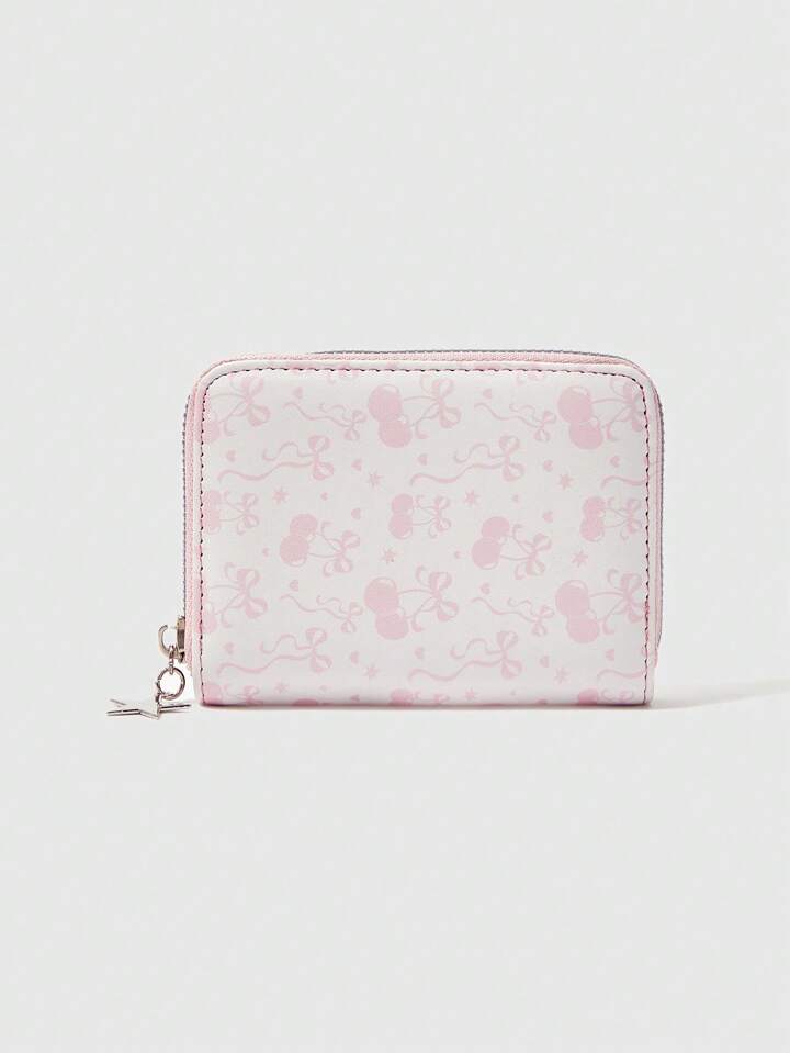 Kawaii Billetera compacta pequeña y linda con estampado de arco y flores de cerezo rosa para mujeres