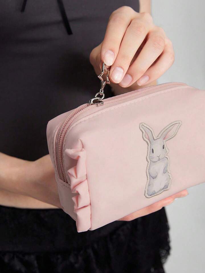 Kawaii Bolsa de cosméticos portátil con bordado rosa lindo de Rabbit