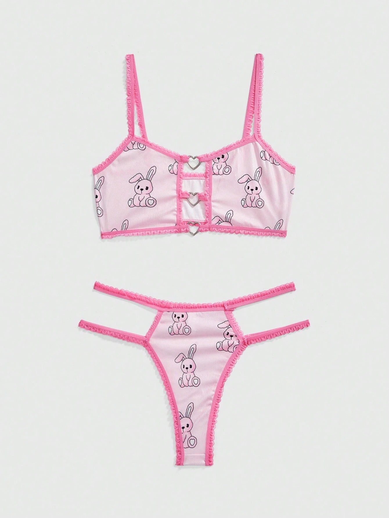 Kawaii Conjunto de sujetador inalámbrico con estampado completo de conejito rosa metálico con corazón sólido lindo para mujeres