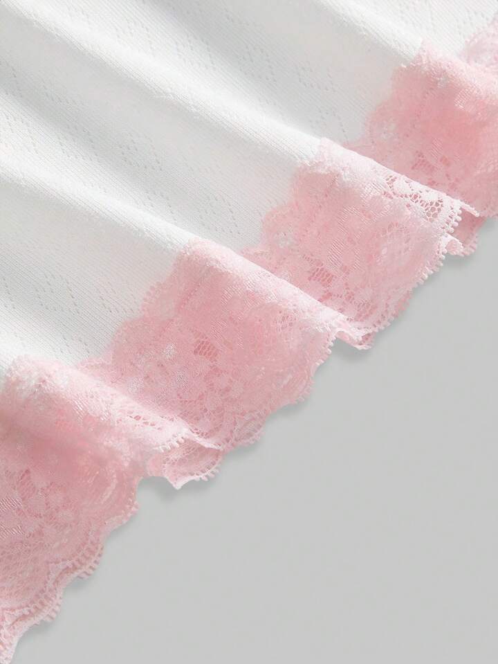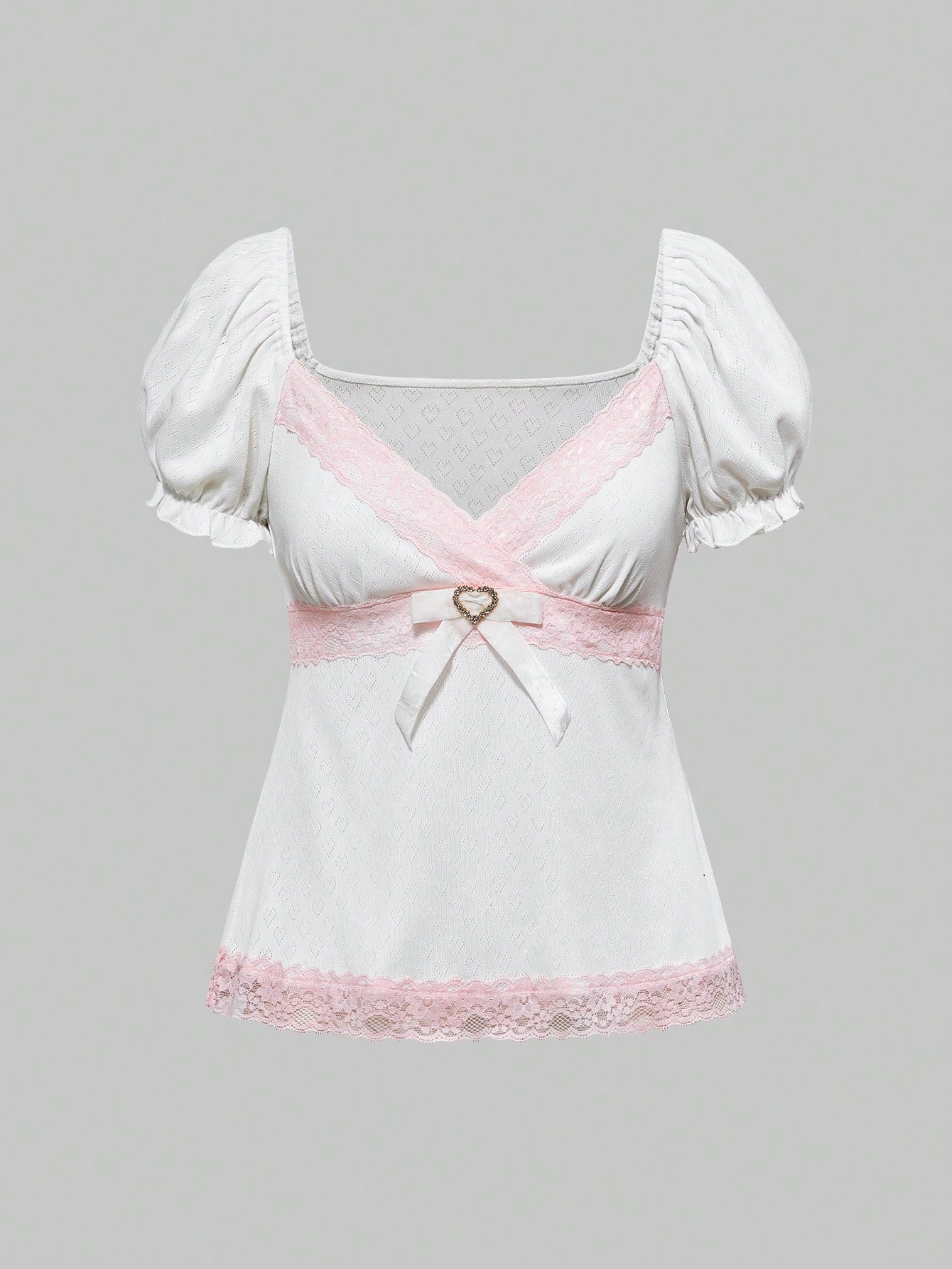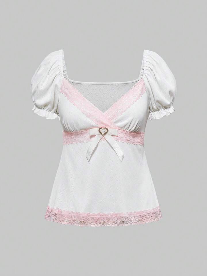 Kawaii Camisa de mujer con diseño de lazo y encaje, de manga abombada y adorable