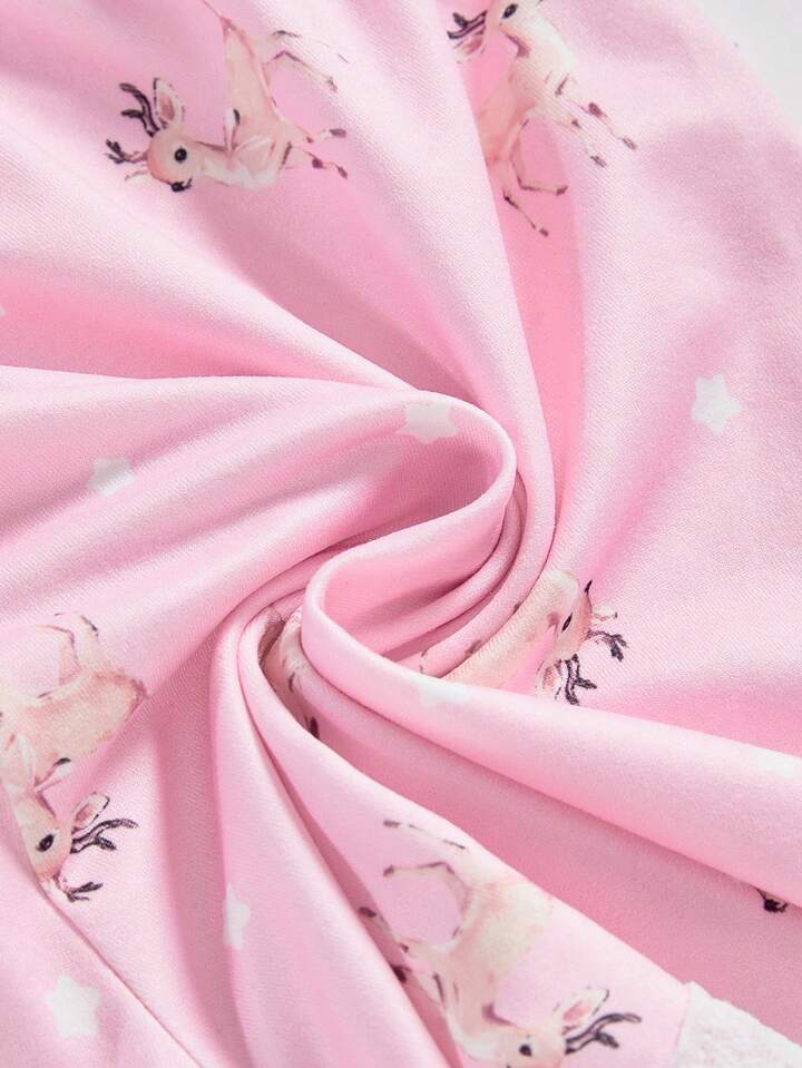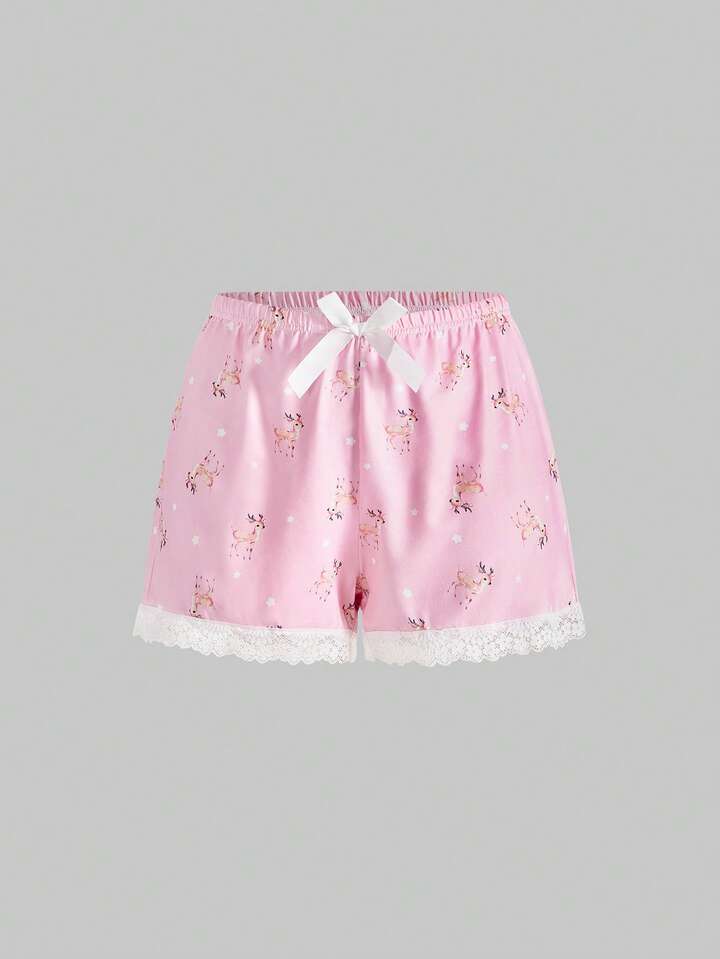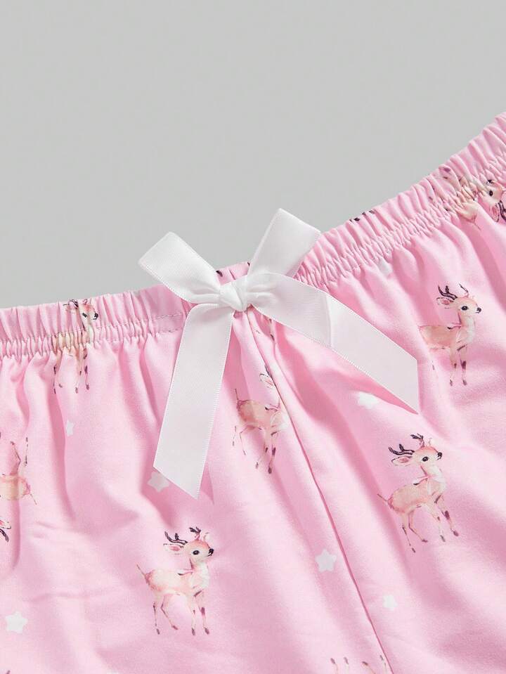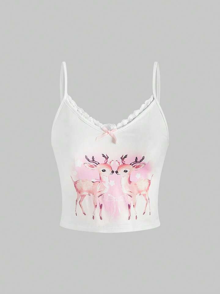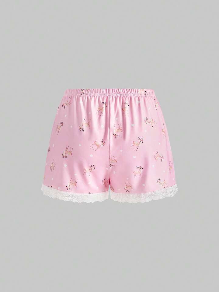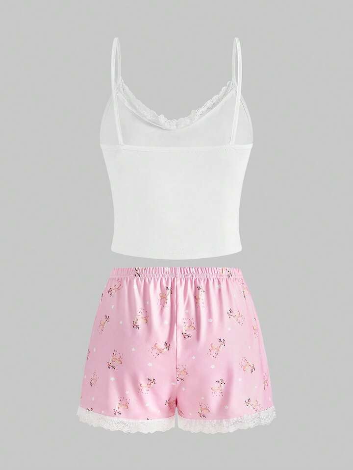 Kawaii Conjunto de pijama de camiseta de tirantes y pantalones cortos con encaje y diseño de ciervos lindos y dulces