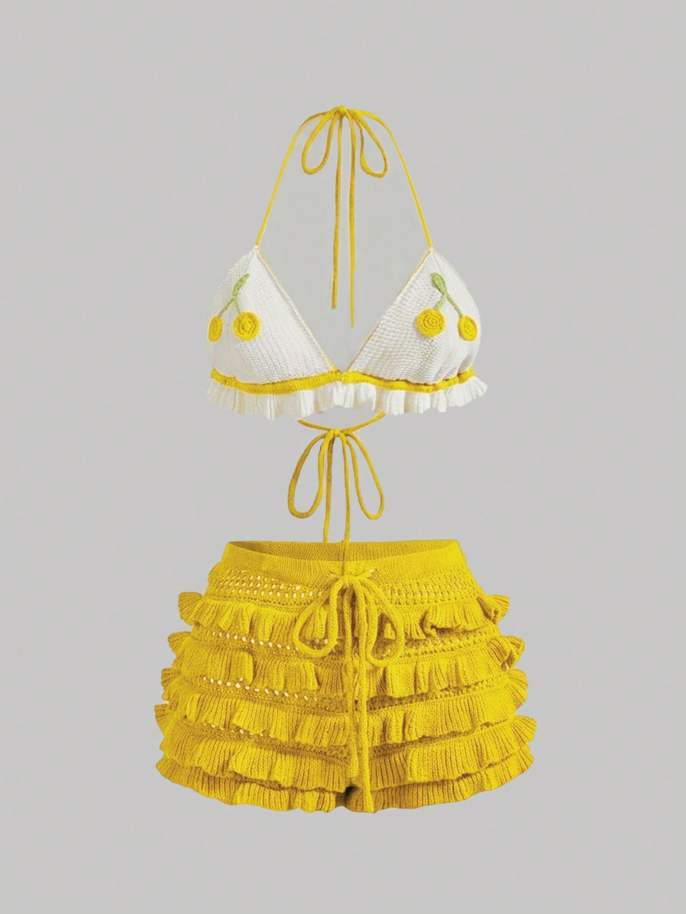 Kawaii Conjunto de 2 piezas de minifalda de ganchillo con cuello halter y falda de pastel de múltiples capas, ideal para vacaciones
