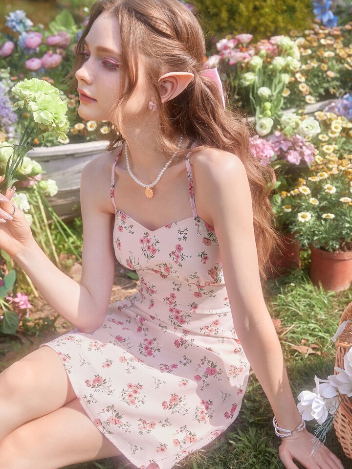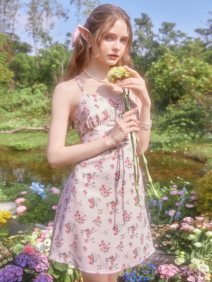 Kawaii Vestido de tirantes con estampado floral de espalda abierta con cordón