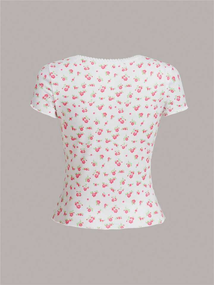 Kawaii Camiseta con estampado floral ribete en forma de lechuga