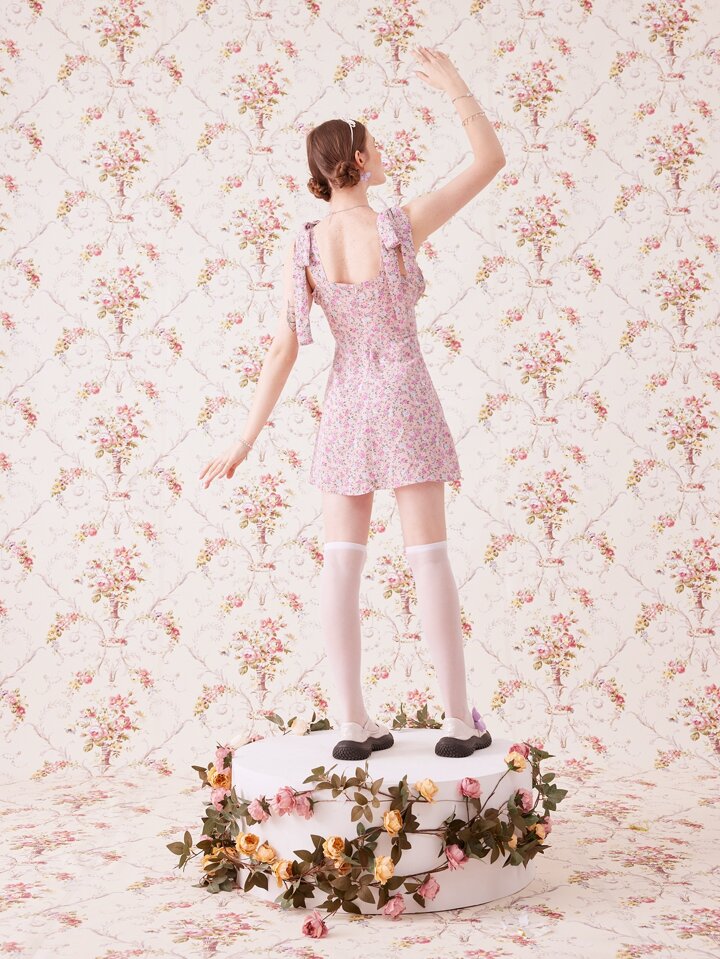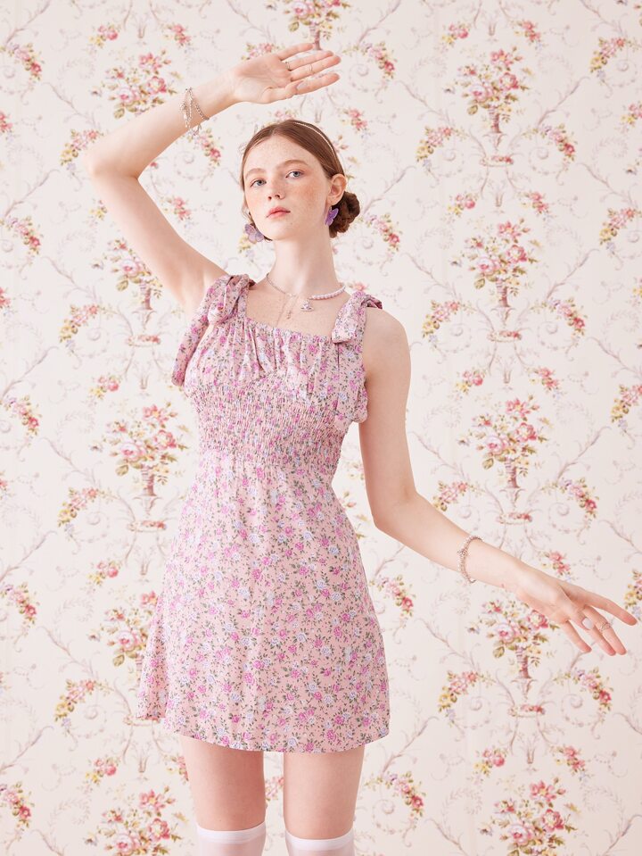 Kawaii Vestido de tirantes floral pecho con fruncido