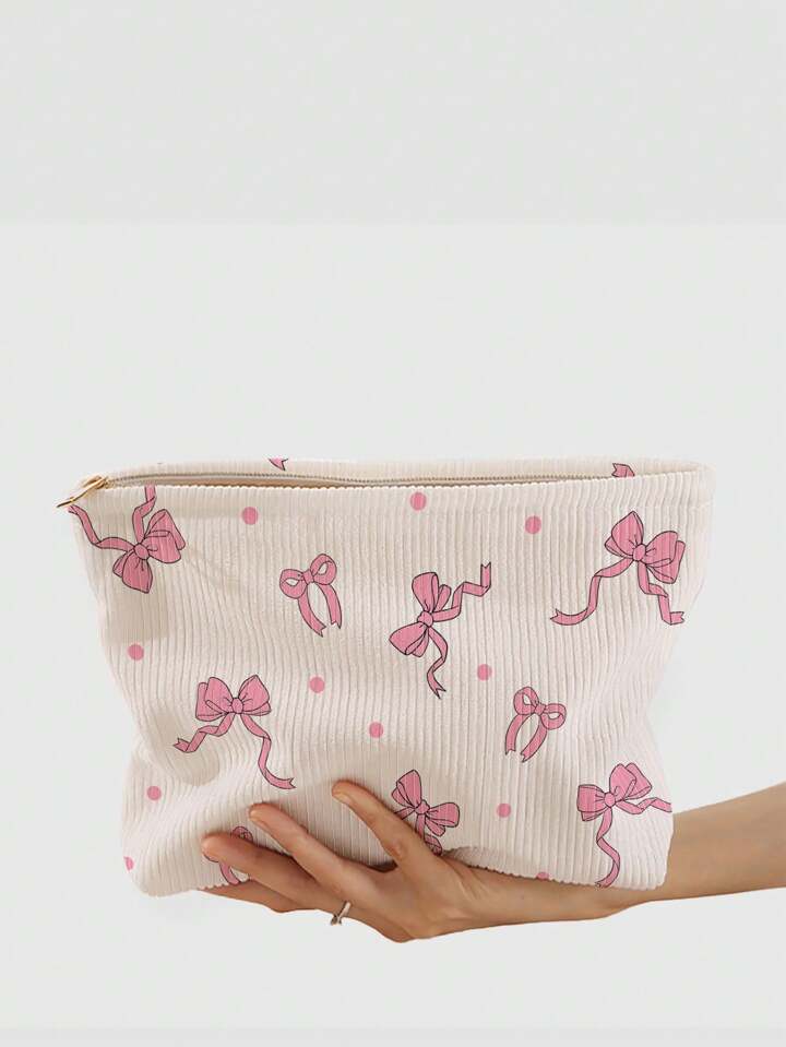 Kawaii Bolsa de maquillaje de pana impresa a doble cara con diseño de lazo